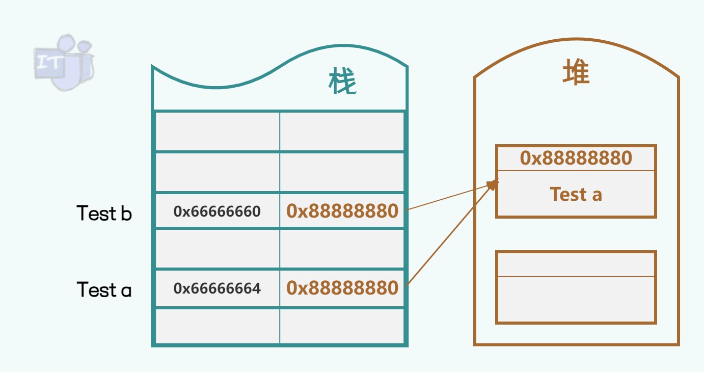 当引用类型按值传递时,调用者会把引用类型变量的引用副本传递给方法,因此被调用方法参数会创建一个新的内存地址用于接收存储变量,而对于一个引用类型变量来说其本身存储的就是引用类型实例对象的引用副本,而方法接收到的也是此变量引用的副本,所以调用者参数和被调用方法参数是引用了同一个实例对象的两个引用副本。如下图Test a可以理解为调用者传的实参,Test b可以理解为被调用方法定义的形参,这两个参数都只是指向堆中Test a的引用副本。