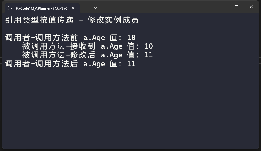 Console.WriteLine($"调用者-调用方法后 a.Age 值:{a.Age}");