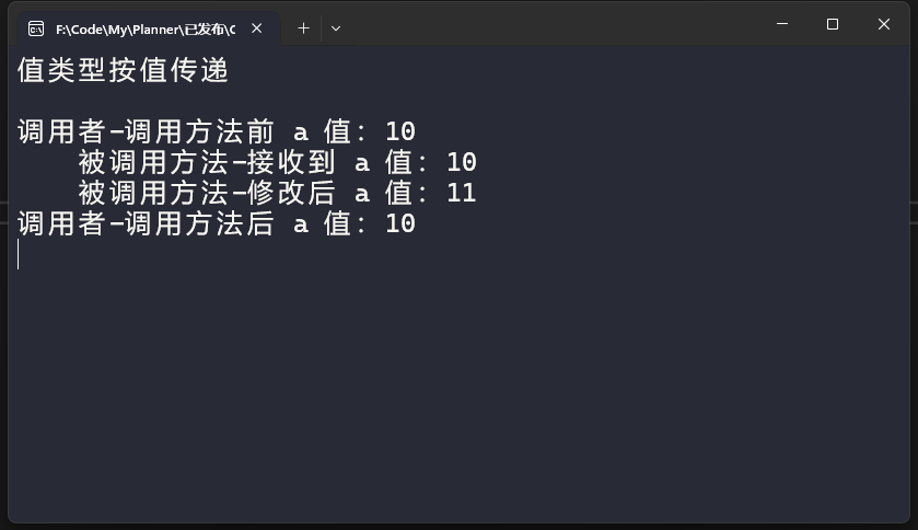 Console.WriteLine($" 被调用方法-修改后 a 值:{a}");