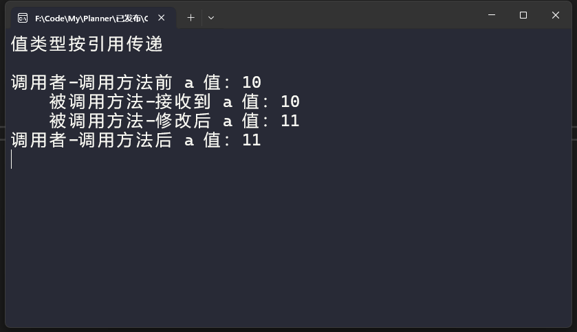 Console.WriteLine($"调用者-调用方法后 a 值:{a}");