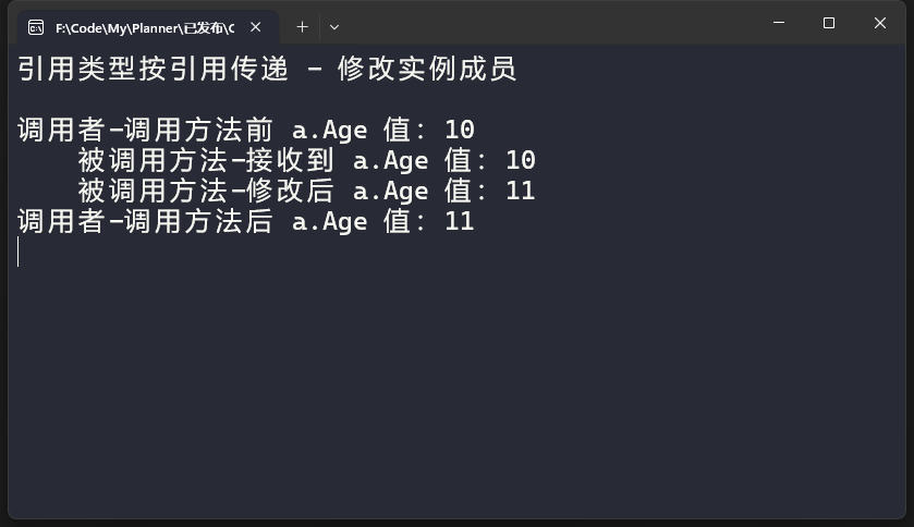 Console.WriteLine($" 被调用方法-修改后 a.Age 值:{a.Age}");