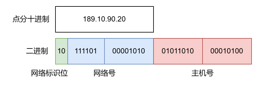 首先我们来理解这张图,以 B 类地址举例,依据 IP 协议的规定,B 类地址的高位是 10,也就是网络标识位,紧随其后的的十四位属于网络号,最后的 16 位是主机号。也就是说,凡是一个 IP 地址的高位是 10,那么这个归属于 B 类 IP 地址。假使出现一个这样的 IP 地址,10111101 00001010 01011010 00010100(189.10.90.20),那么其网络号和主机号如下图所示:
