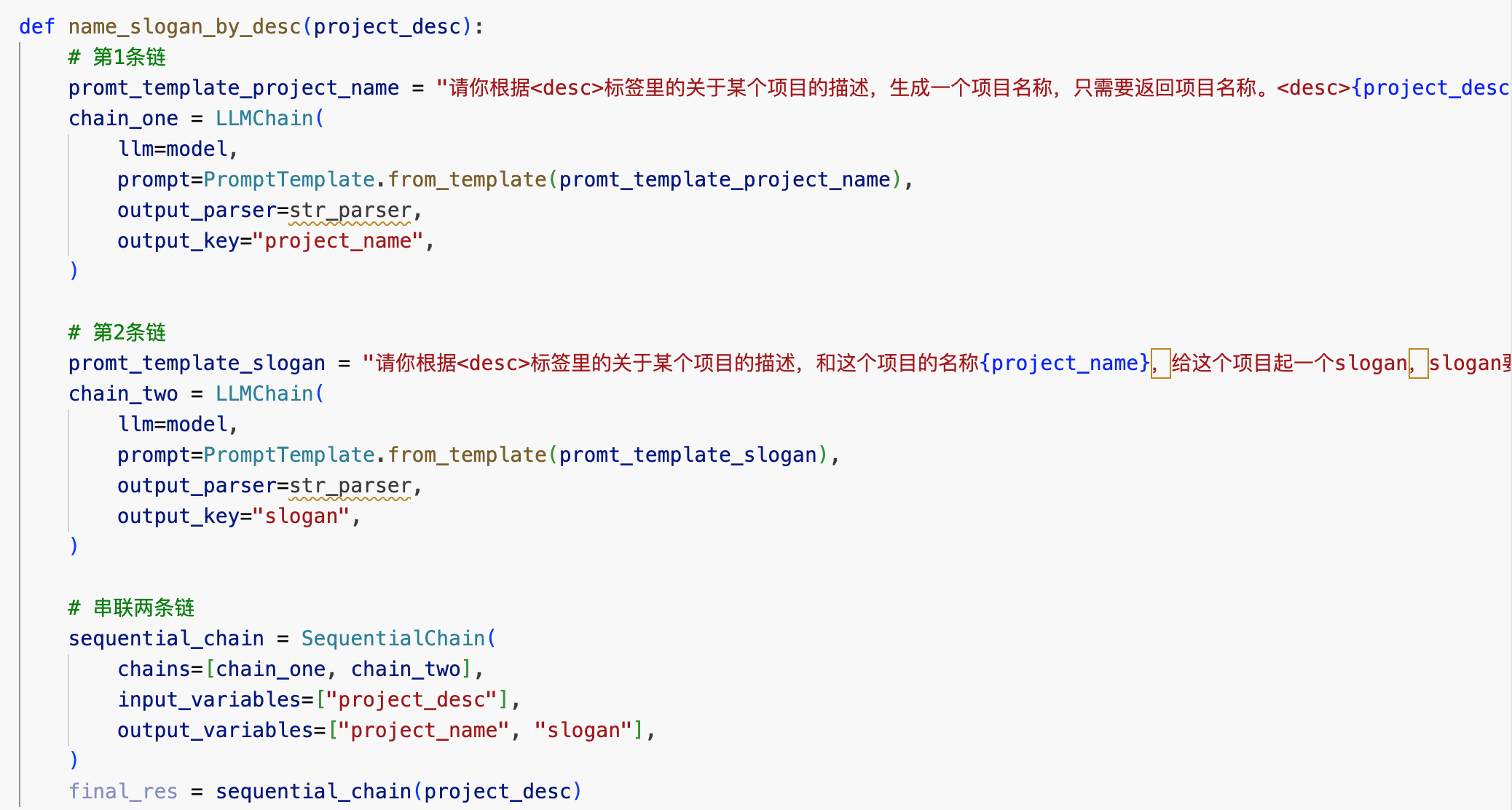 接下来,我们使用 LangChain 的 Chain 功能,来实现相同的功能。代码如下: