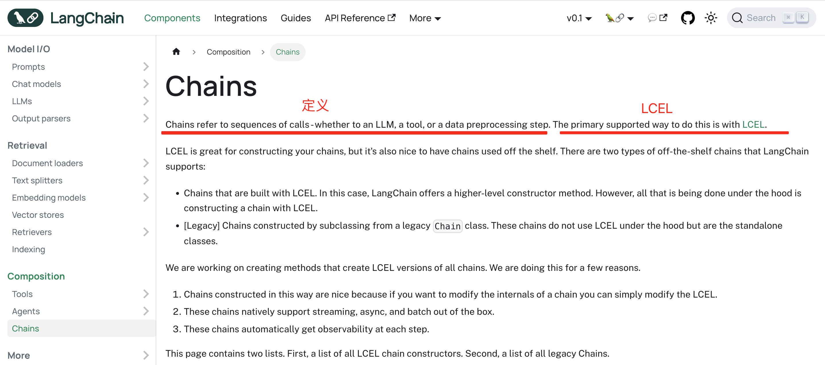 再看看官网的解释:Chain是指调用的序列 - 无论是调用 LLM、工具还是数据预处理步骤,主要支持的方法是使用 LCEL。