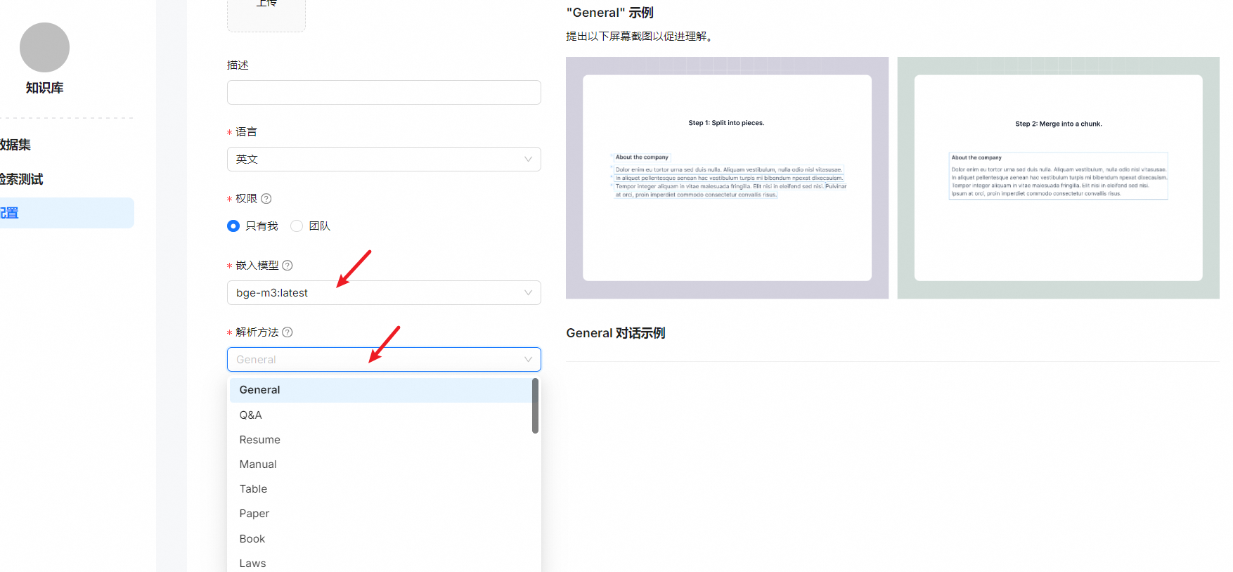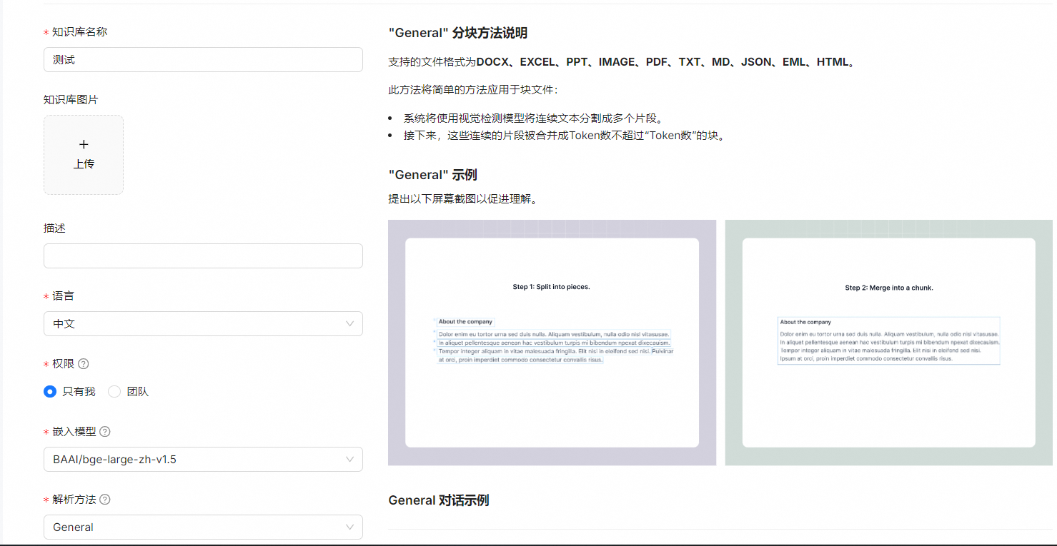 | General | Files are consecutively chunked based on a preset chunk token number. | DOCX, EXCEL, PPT, PDF, TXT, JPEG, JPG, PNG, TIF, GIF |
