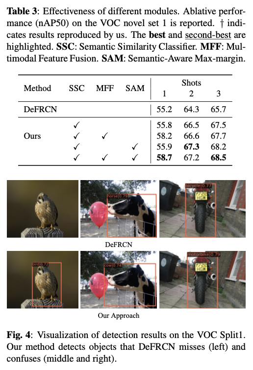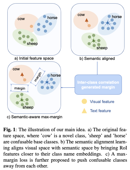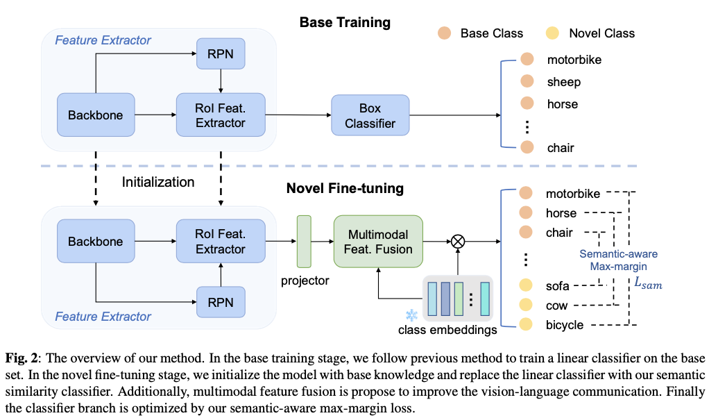 论文提出一个基于微调的框架,利用语义嵌入来提高对新颖类别的泛化能力。该框架在微调阶段用语义相似分类器(SSC)取代线性分类器,通过计算类名嵌入和提议物体区域特征之间的余弦相似度产生分类结果。此外,论文提出了多模态特征融合(MFF)来对视觉和文本特征进行深层融合。论文还在原始交叉熵损失之上应用了语义感知最大间隔(SAM)损失,以区分与自身相似的新颖类别和基础类别,如图1所示。在微调过程中,SSC和MFF通过经典的Faster R-CNN损失和SAM损失以端到端的方式进行优化。