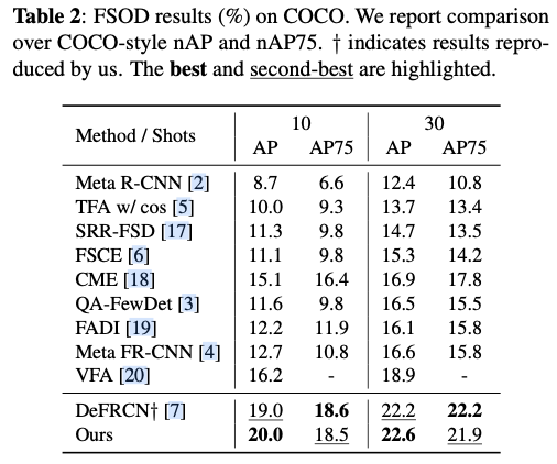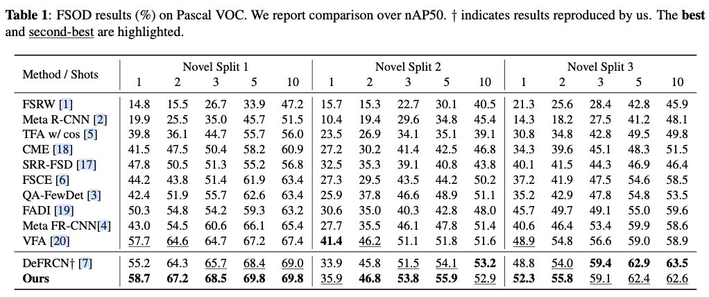论文的方法可以以即插即用的方式应用于任何基于微调的Few-shot检测器,并将论文的方法与之前的最先进方法DeFRCN进行集成以进行验证。与TFA不同的是,DeFRCN在第二阶段冻结大多数参数以防止过拟合,提出了Gradient Decoupled Layer来截断RPN的梯度并调整两个阶段中R-CNN的梯度。