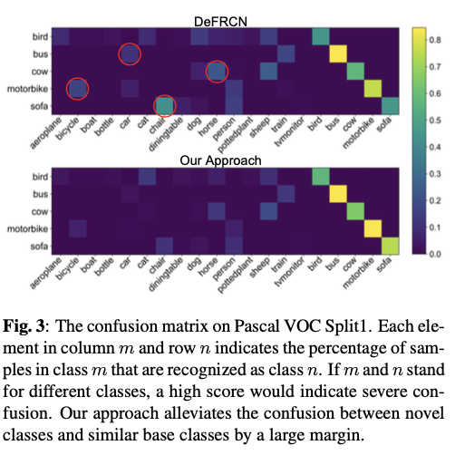 FSOD方法在训练样本极为有限时会出现性能下降,例如,当每个类别只有一个带标注的边界框时。只有一个对象无法很好地代表外观多样的类别是合理的,这种偏向性表示严重损害了新颖类别的性能。FSOD的性能继续受到新颖类别和基础类别之间混淆的威胁。仅有少量带标注样本时,新颖类别几乎无法构建紧凑的特征空间。这可能造成新颖类可能散布在类似基础类别良好构建的特征空间中,导致分类混淆。
