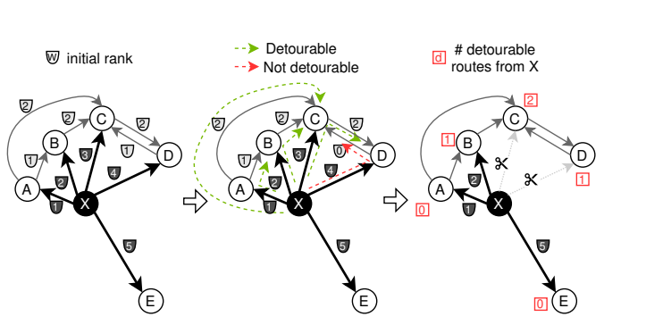 中间:可能的两跳路径(XAB、XBC、XCD、XAC、XDC),根据方程3被分类为可绕路和不可绕路的。我们使用排名代替距离。