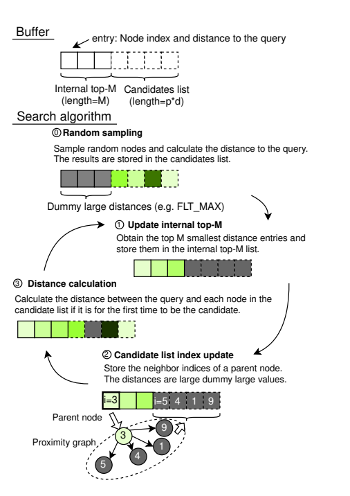 这里需要特别提一点就是这里的buffer。其实是两部分的,前半部分top-M的,我猜测是有序的,后半部是候选访问区,不必一定保证有序。