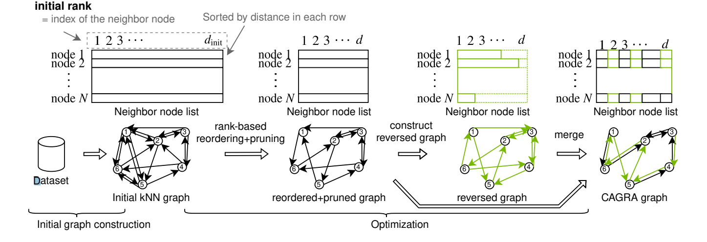 CAGRA算法的构建训练过程,先初始化一个knn graph,然后优化其中的边关系。