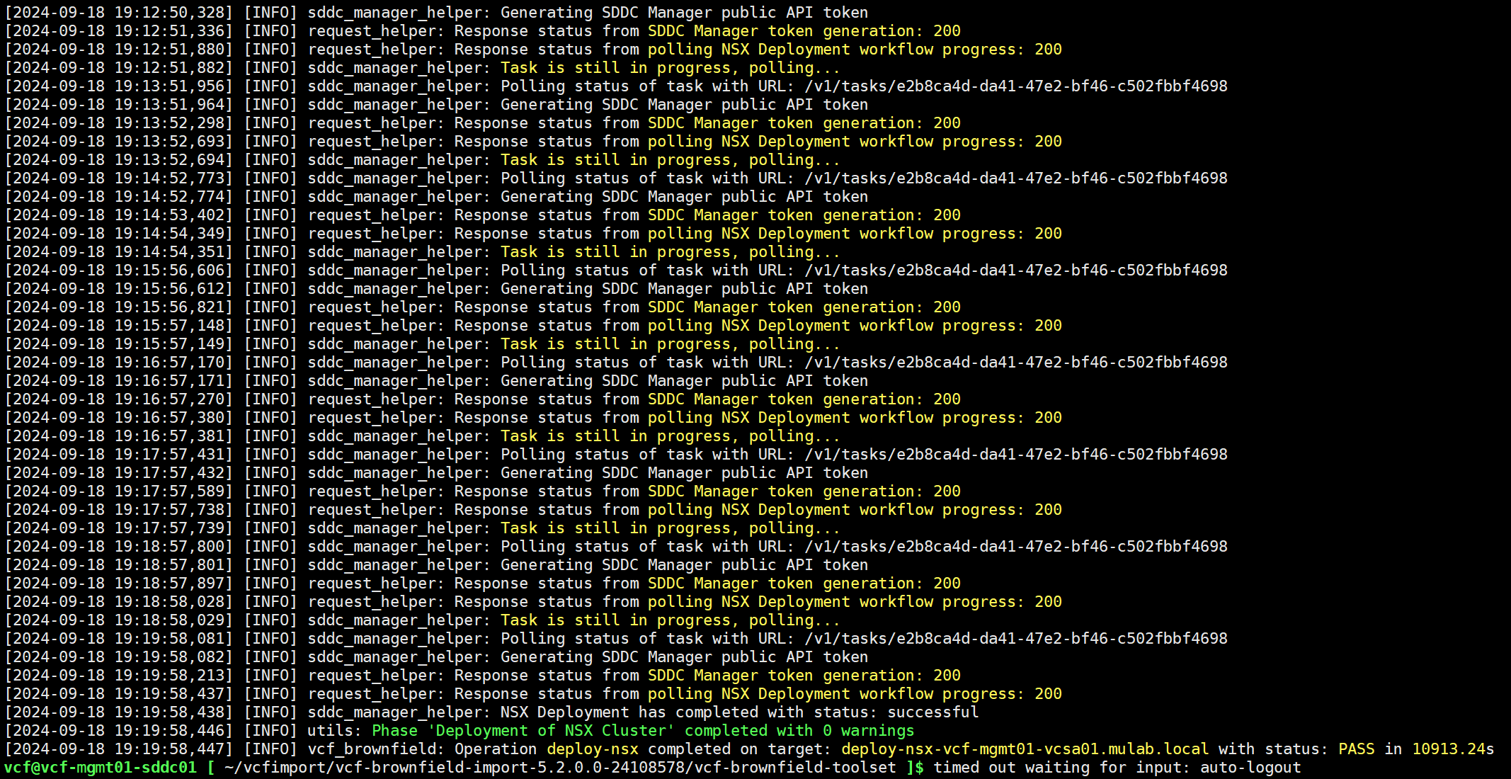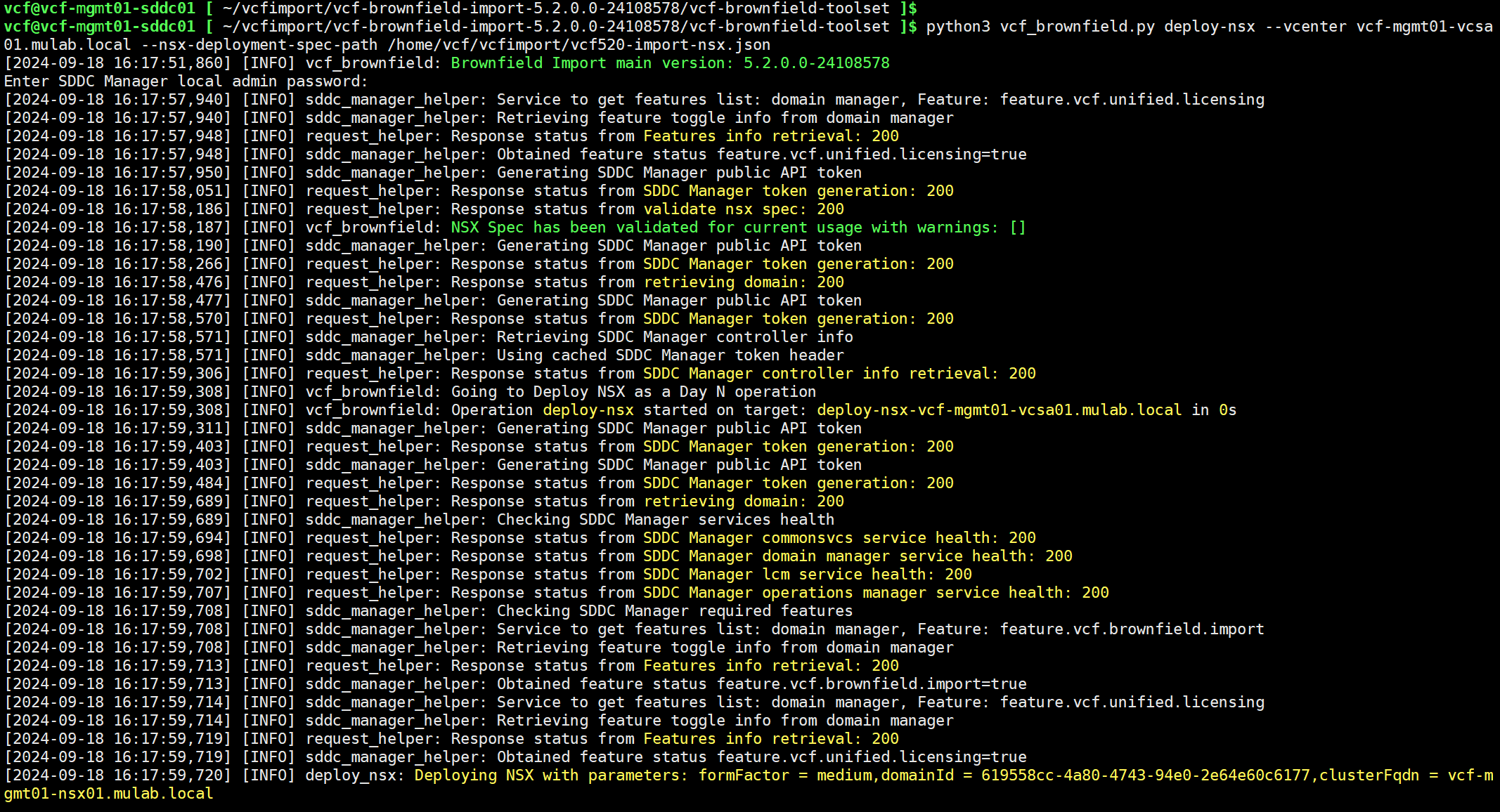python3 vcf_brownfield.py deploy-nsx --vcenter vcf-mgmt01-vcsa01.mulab.local --nsx-deployment-spec-path /home/vcf/vcfimport/vcf520-import-nsx.json