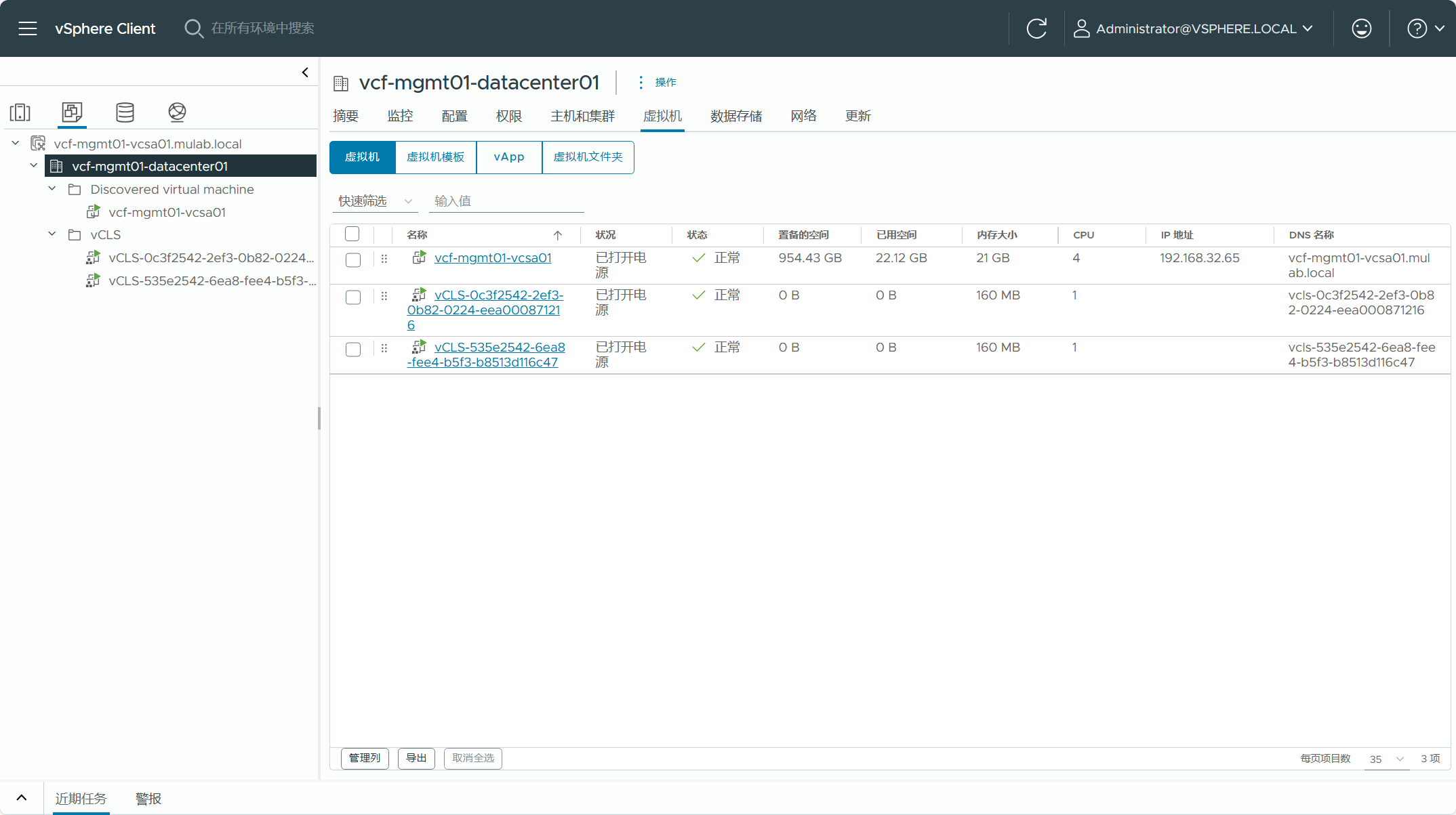 现有 vSphere 集群中当前有 vCenter Server 虚拟机和 vCLS 集群服务虚拟机,如果转换为管理域,则 vCenter Server 虚拟机必须存在于于这个集群之中,不能位于其他位置,如果有多个集群并且用于转换的集群中没有 vCenter Server 虚拟机,则需要先将虚拟机迁移到管理域集群。