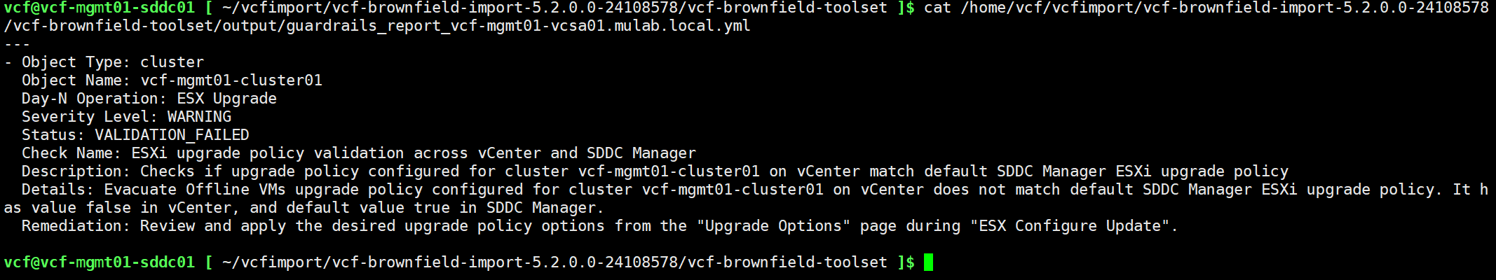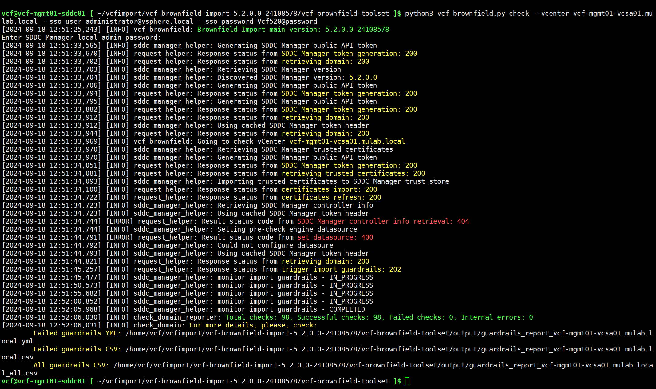 python3 vcf_brownfield.py check --vcenter vcf-mgmt01-vcsa01.mulab.local --sso-user administrator@vsphere.local --sso-password Vcf520@password