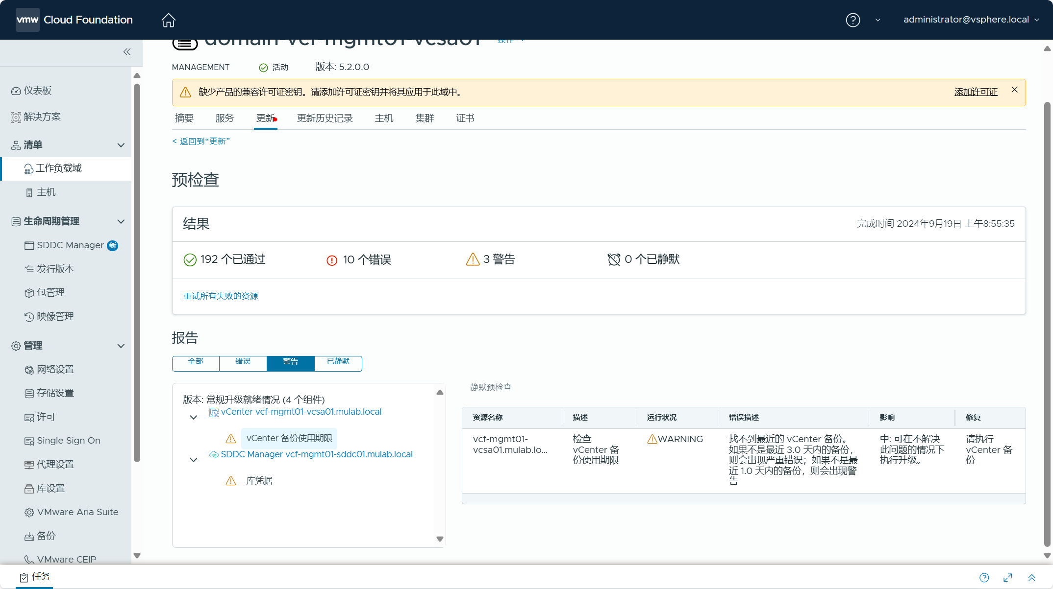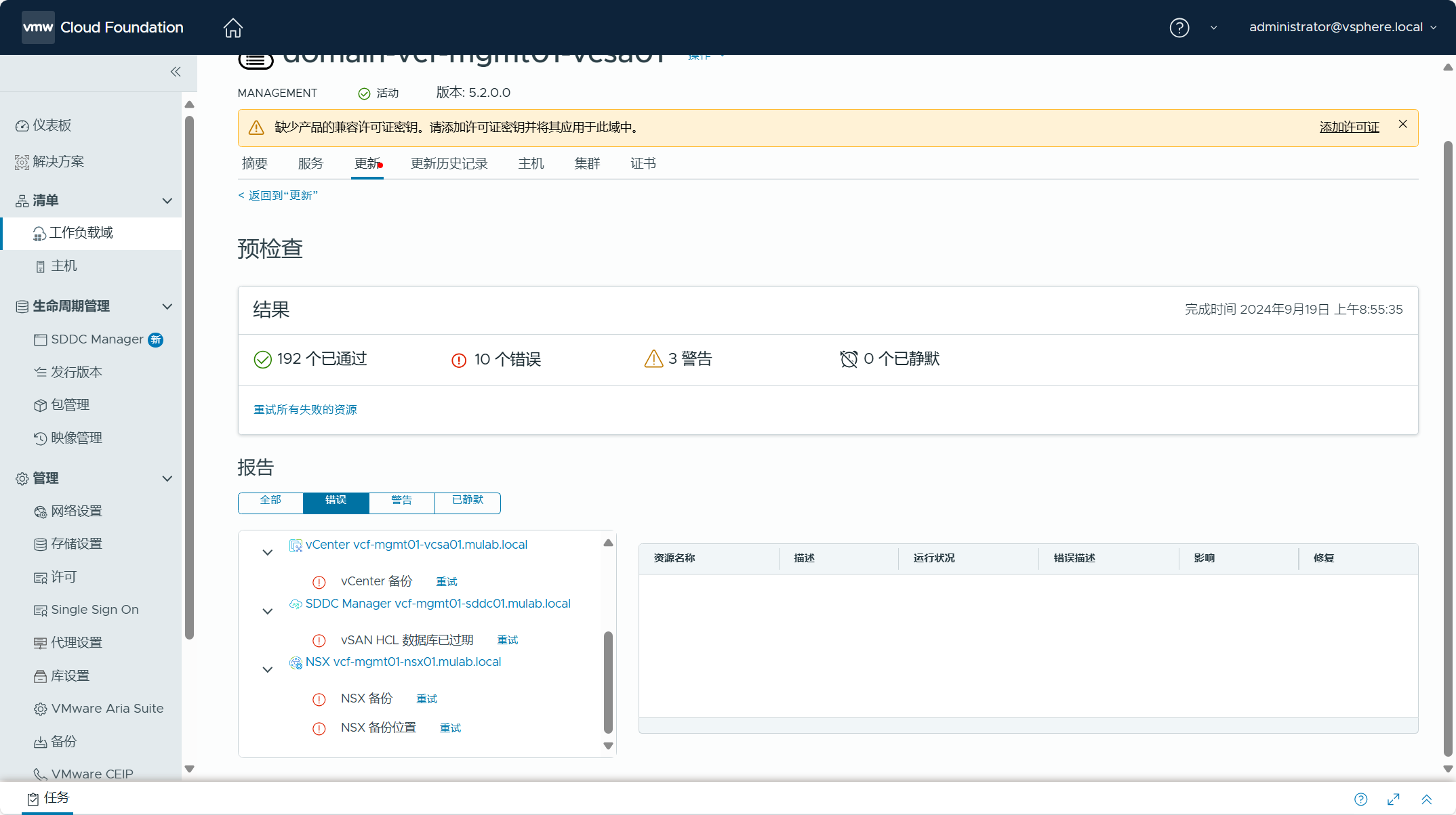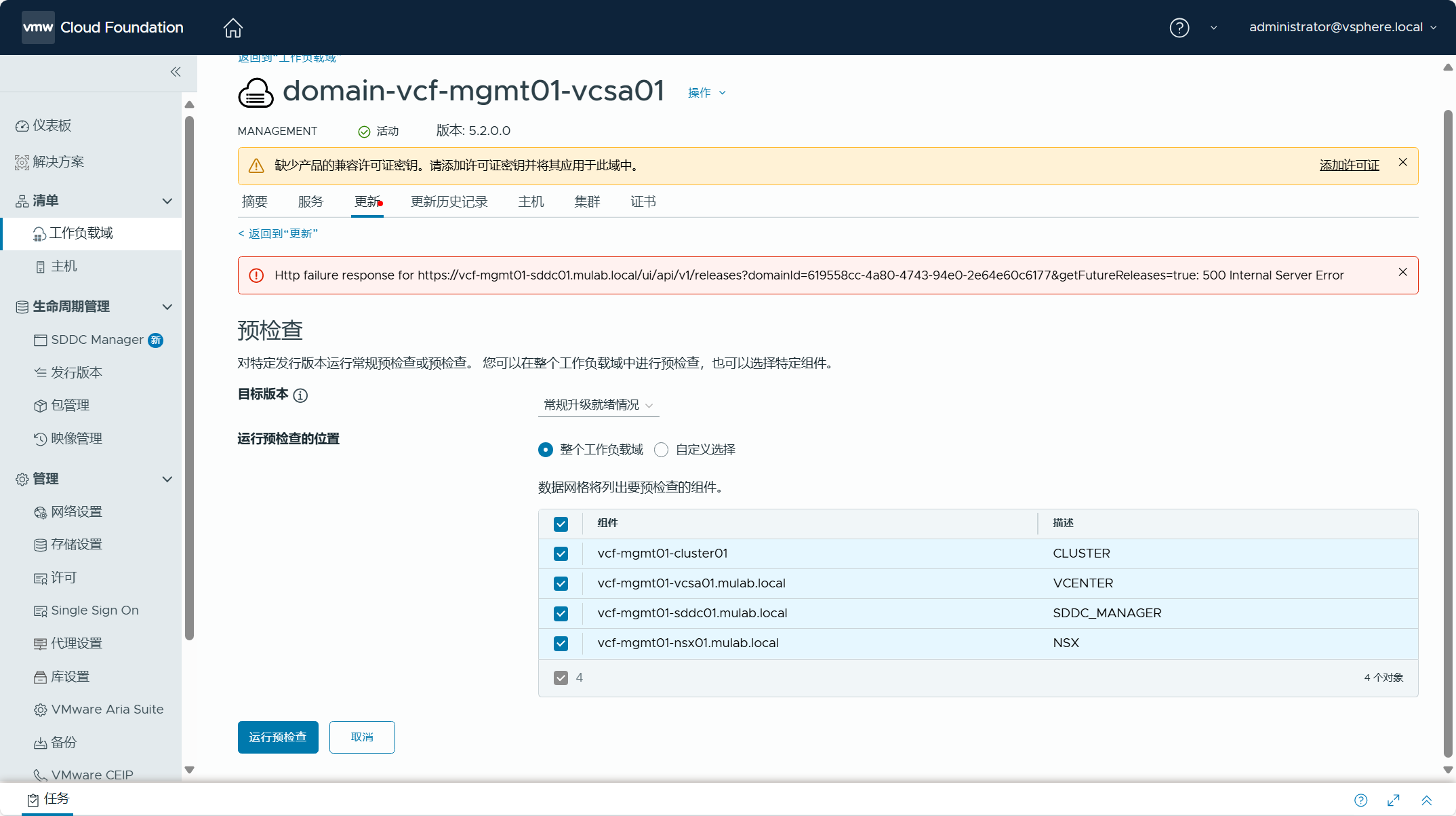 可以对管理域执行一下预检查,检查各个组件和配置是否正常。