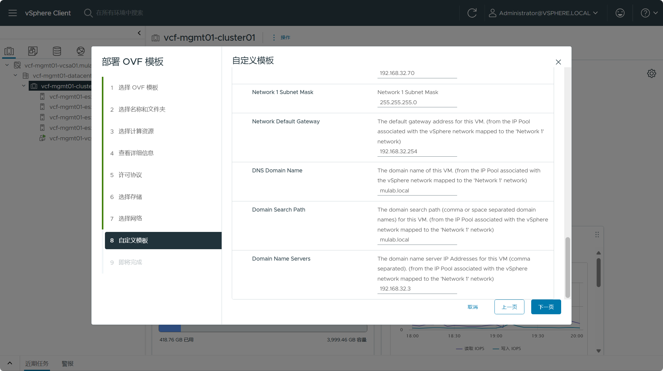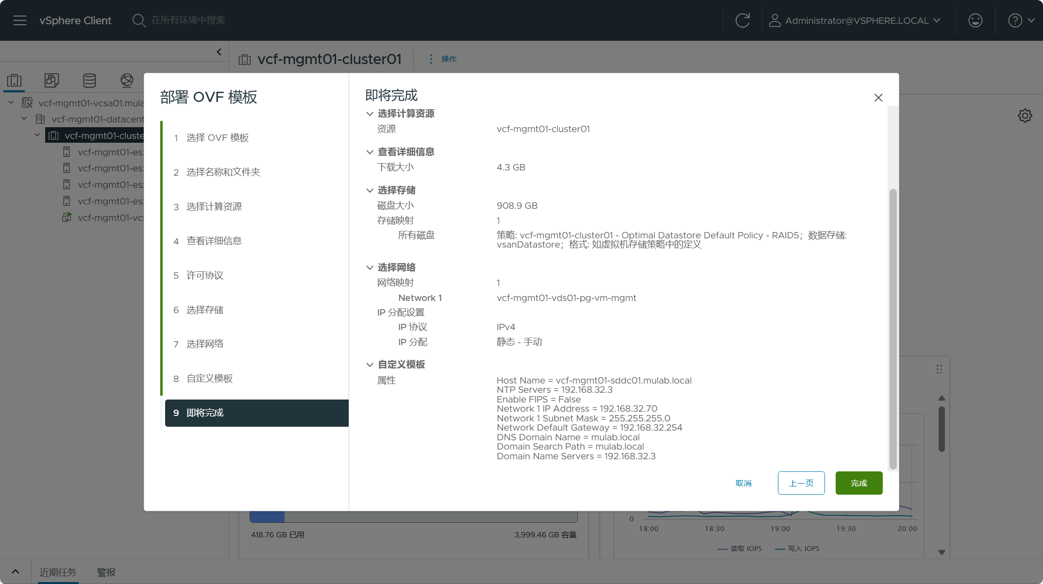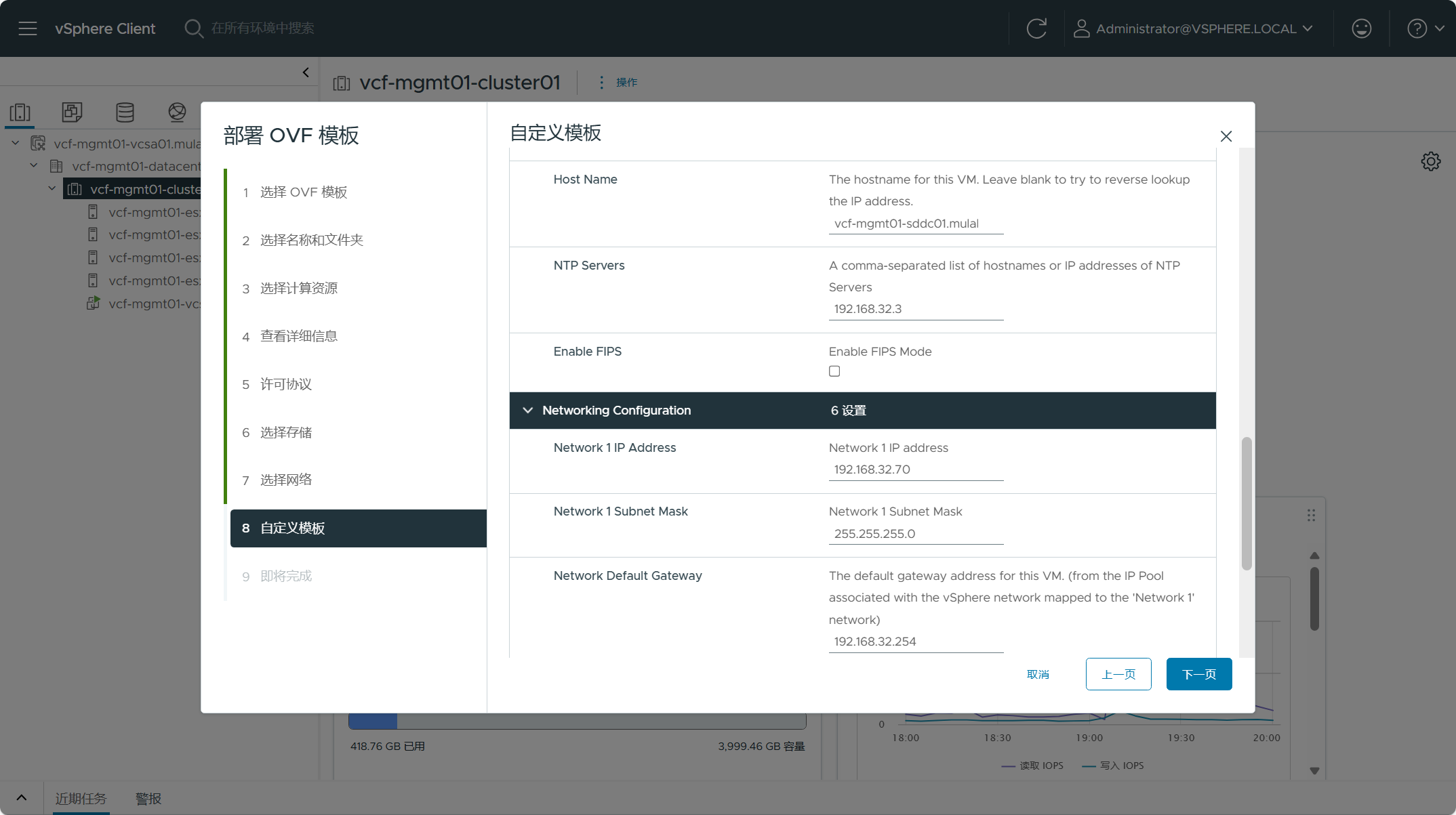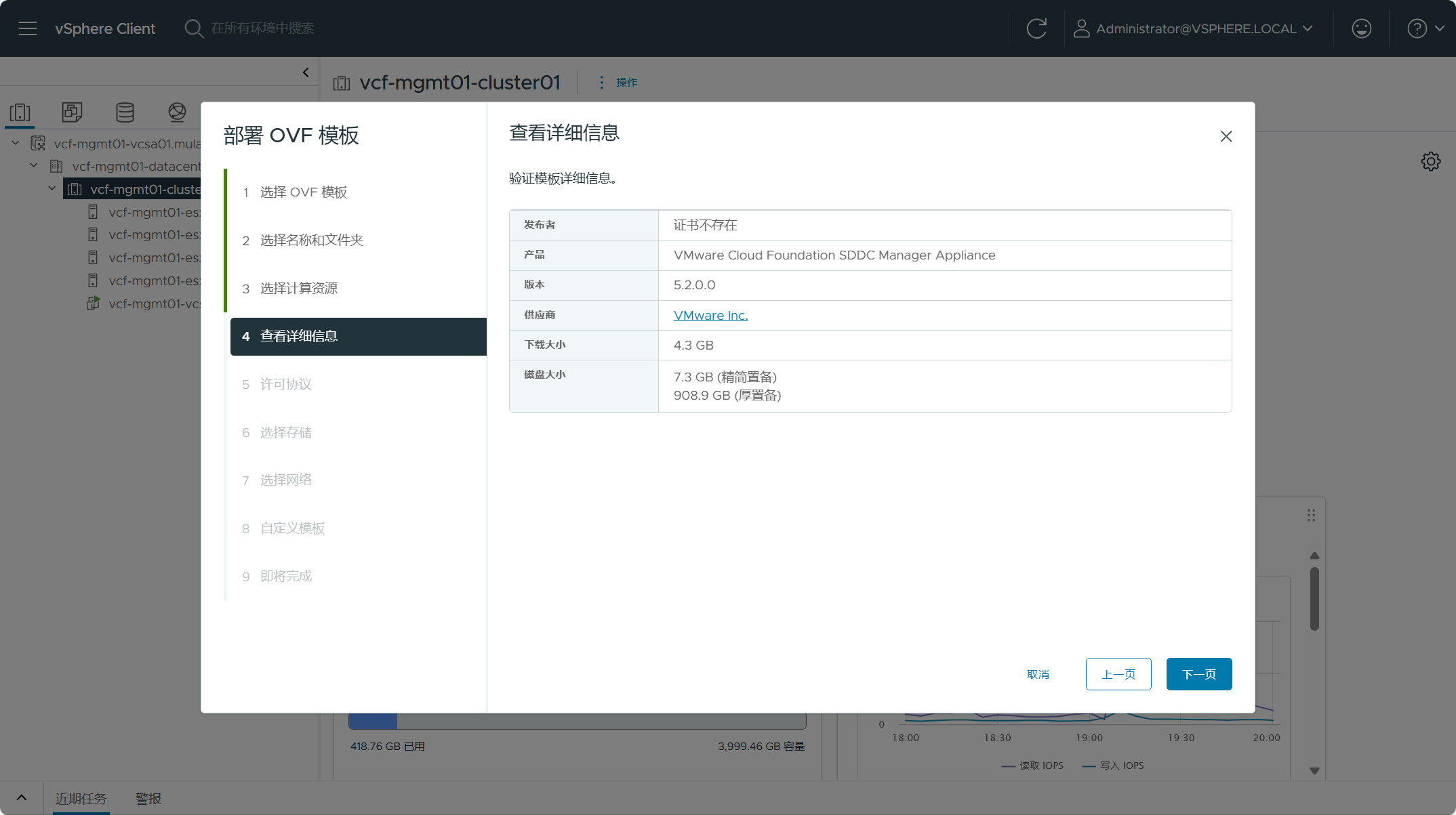 检查 SDDC Manager OVA 设备的摘要信息,点击下一页。