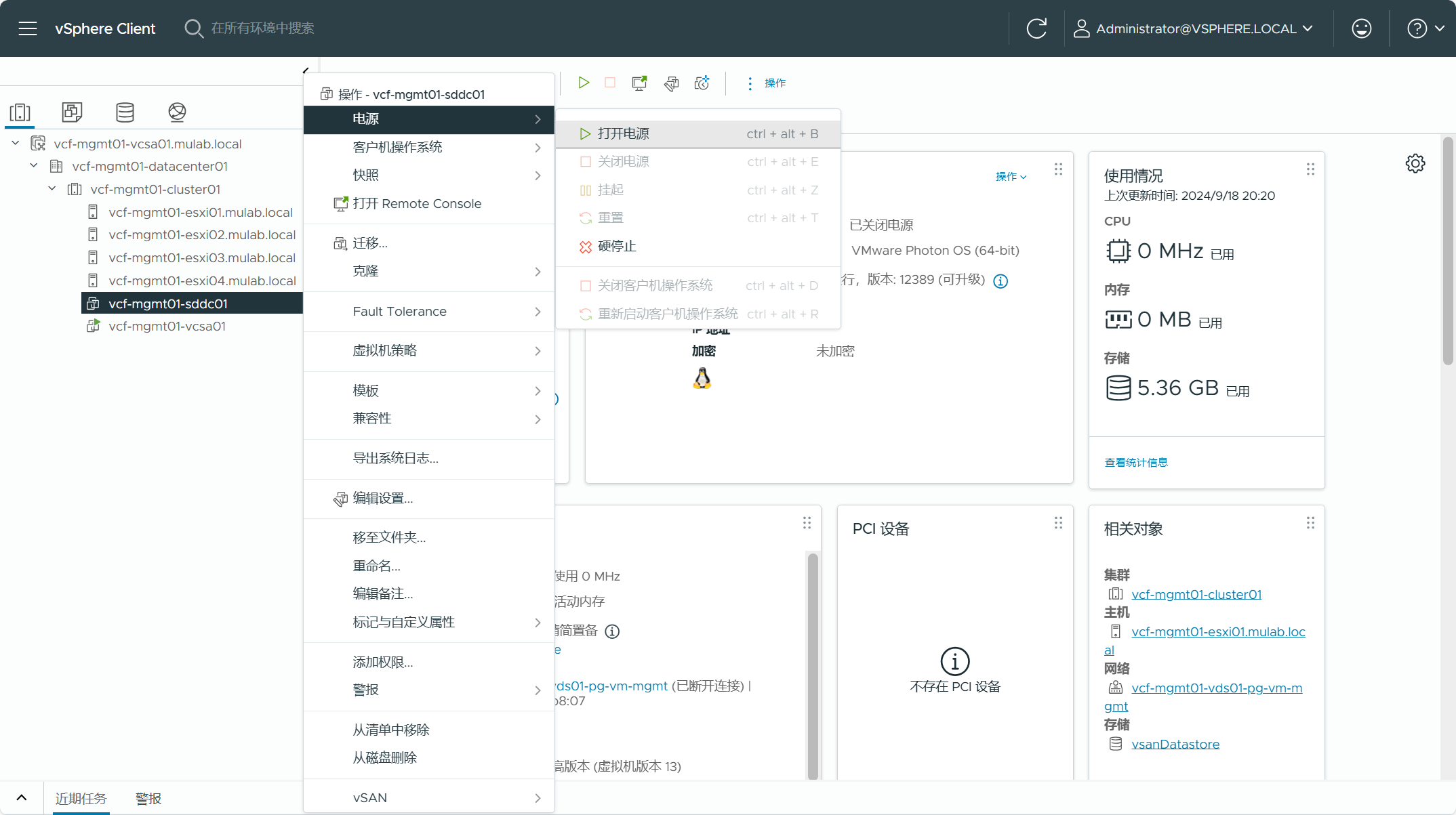 右击 SDDC Manager 虚拟机,点击打开电源。