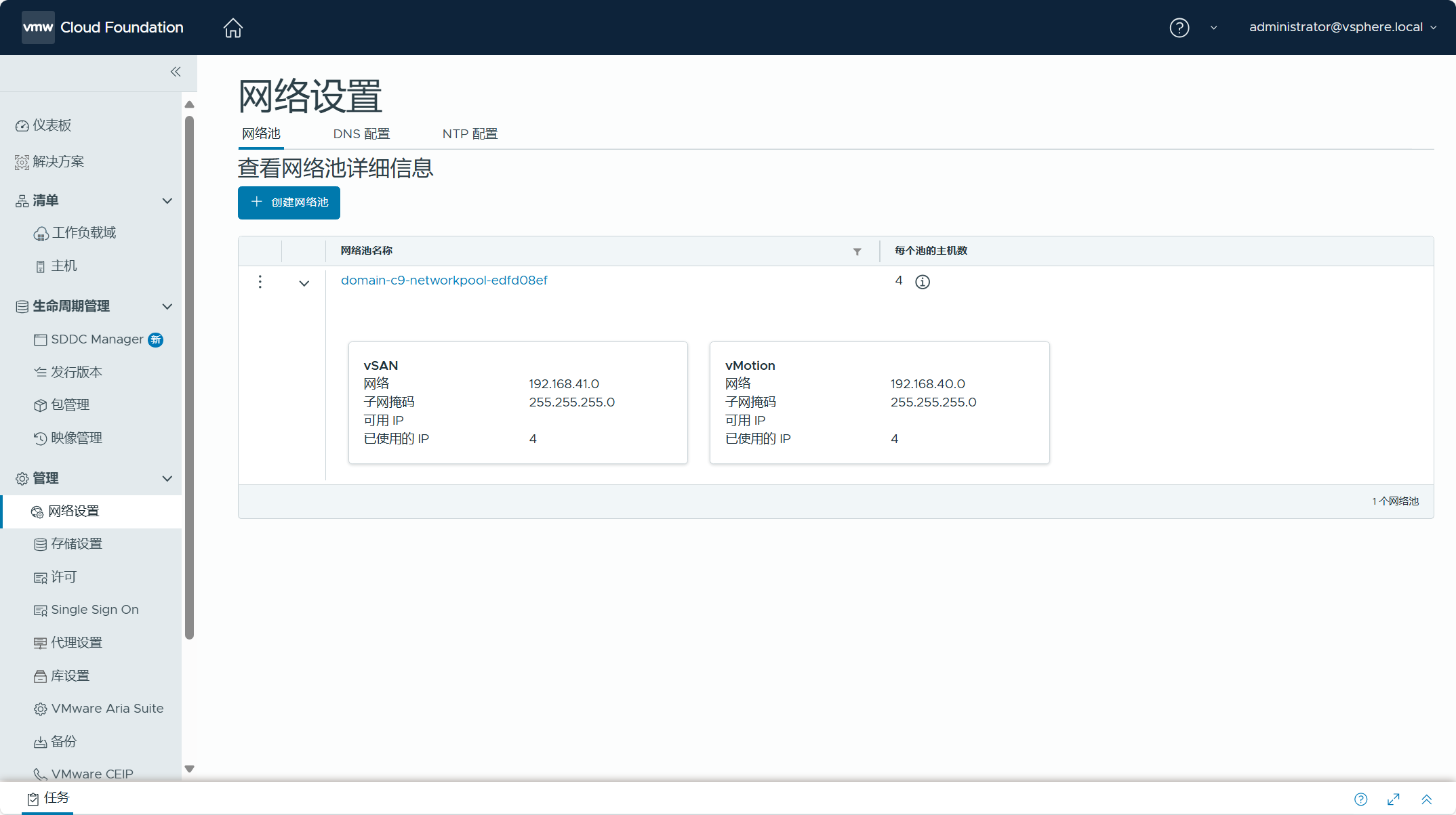 导航到 SDDC Manager UI->管理->网络设置,可以看到 vSphere 环境中 ESXi 主机的 VMkernel 网卡,用于 vMotion 服务和 vSAN 服务的静态 IP 地址已经被创建为网络池。