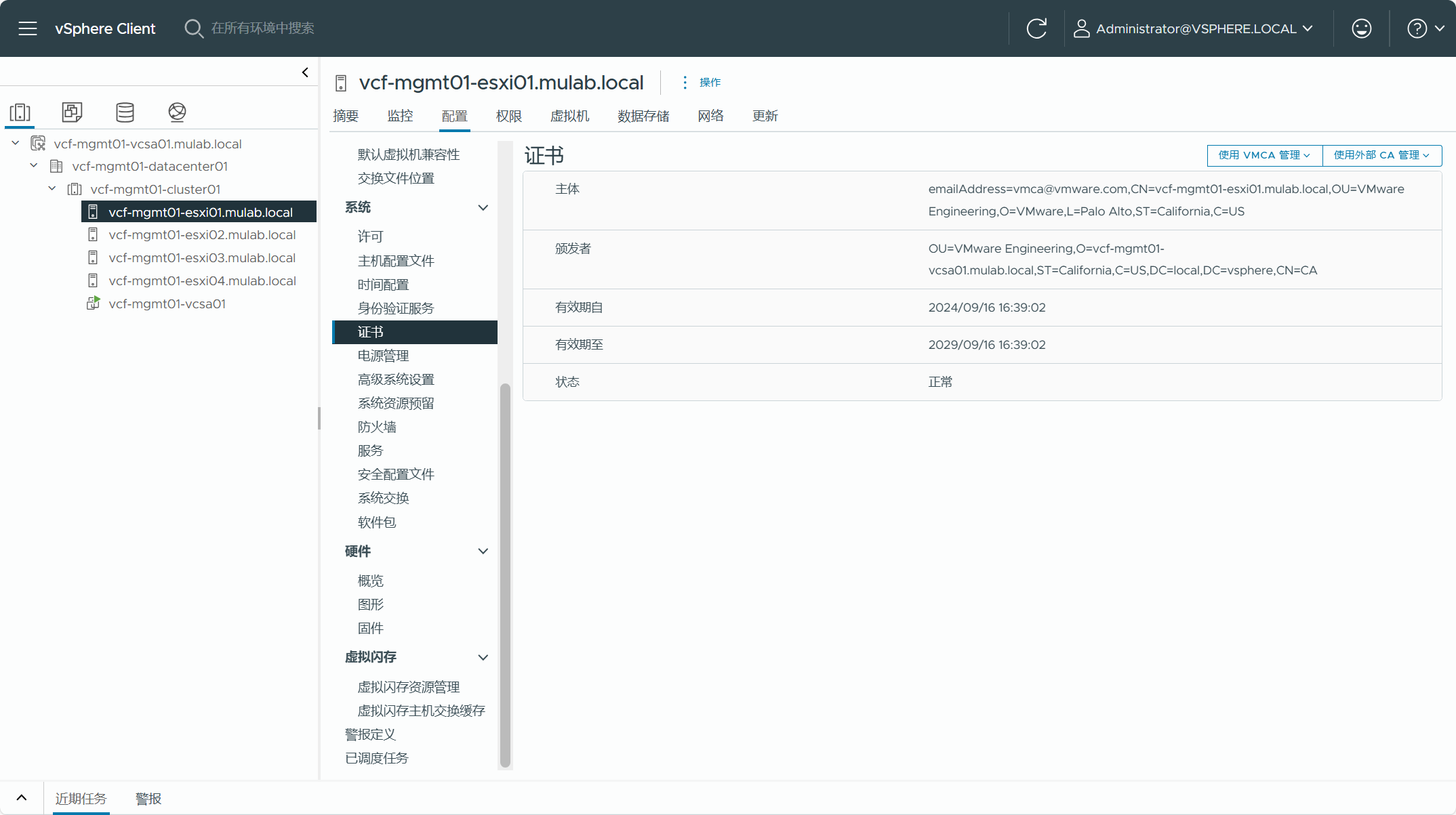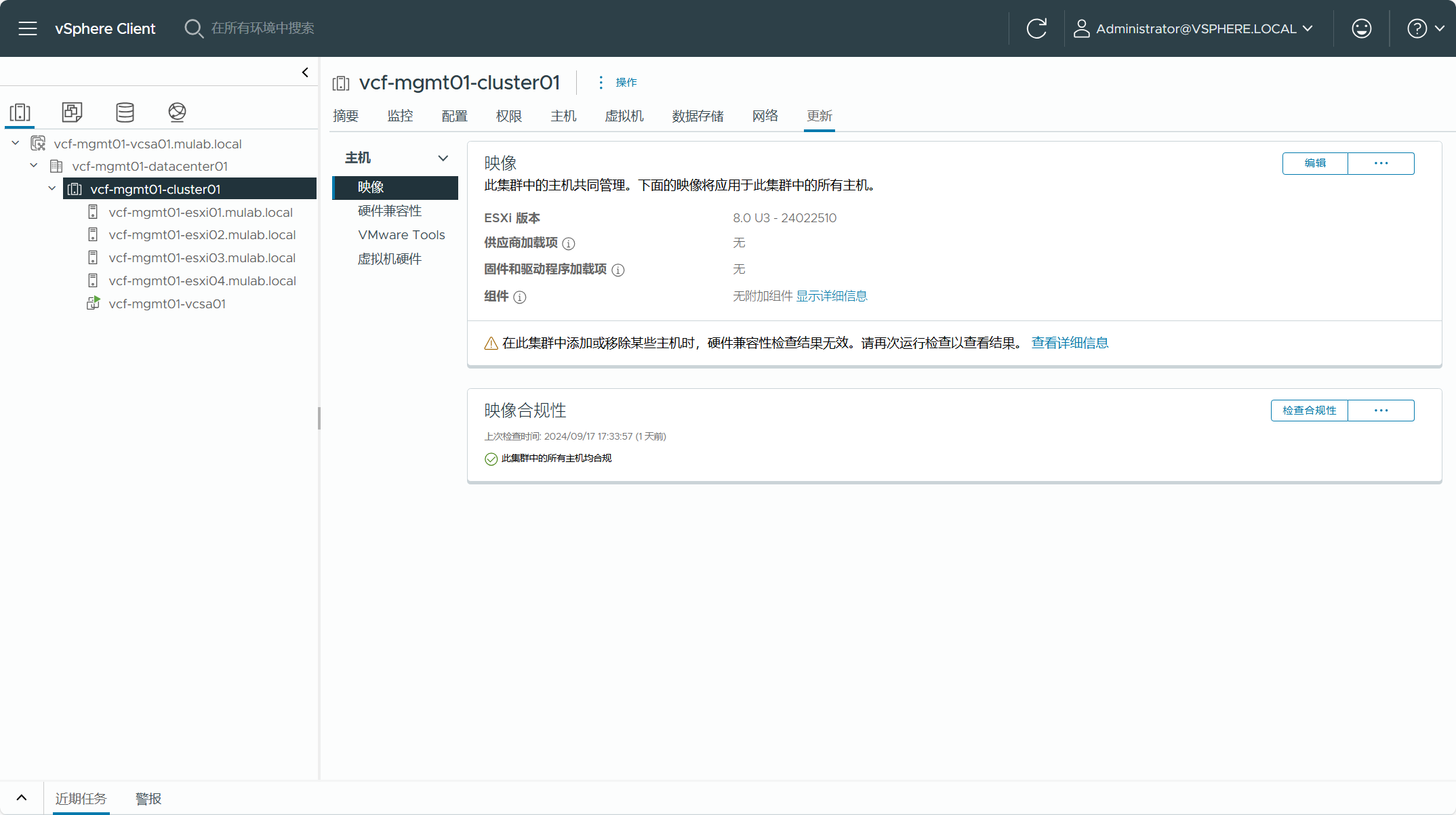 现有 vSphere 环境中用于转换为管理域集群内的主机必须是 VCF 5.2 BOM 物料清单中的版本,如果实际环境中不是这个版本,需要将 ESXi 主机升级到该版本(或更高)。由于集群使用了 vSAN 存储,所以集群内的主机要求至少具有 4 台。当前 vSphere 环境中不支持位于数据中心或主机文件夹的独立主机,如果有独立主机,则必须移至某个集群内。