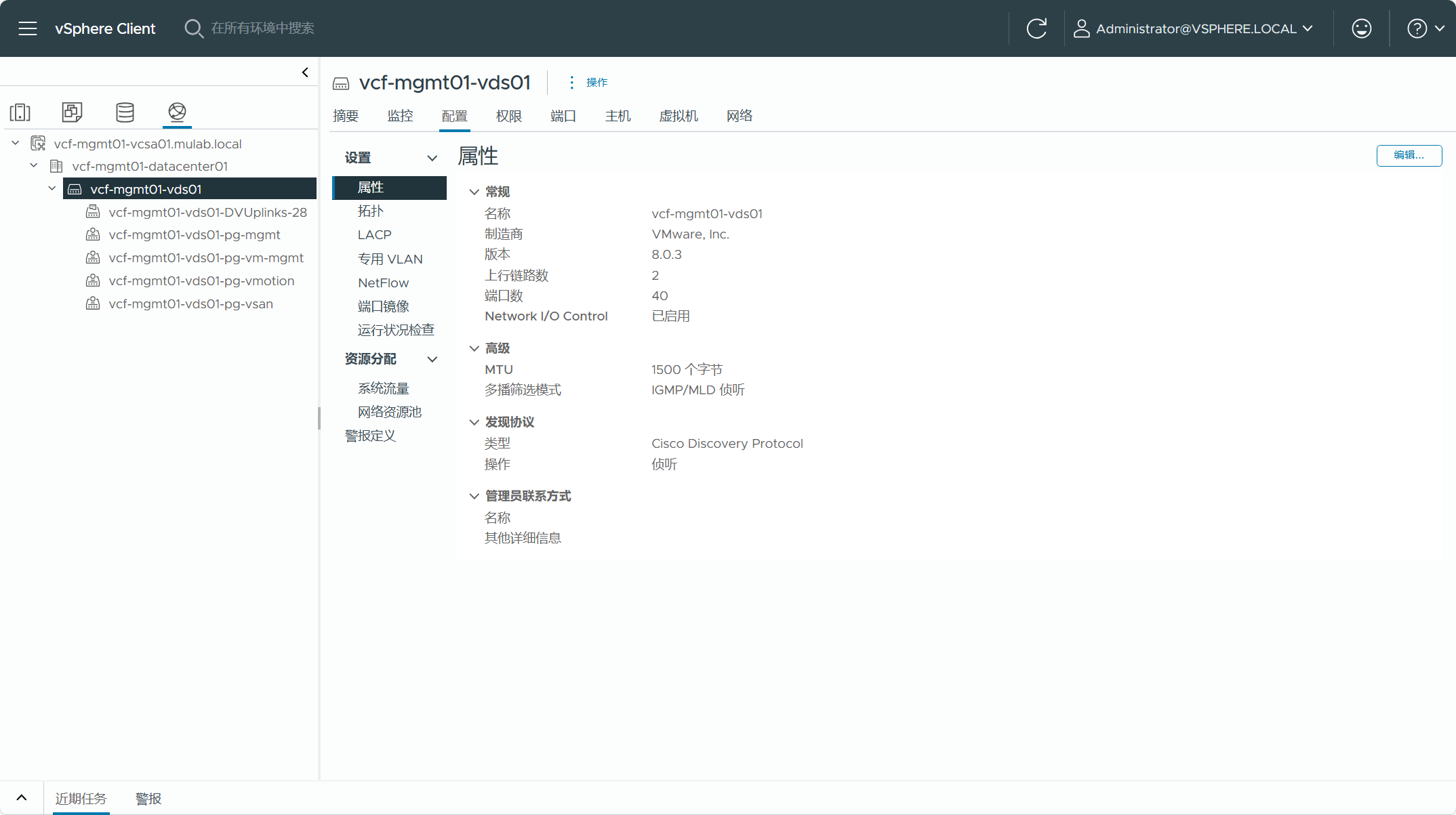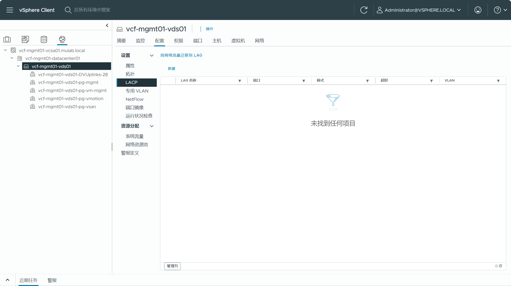 现有 vSphere 集群所使用的 VDS 分布式交换机,转换为管理域的集群不能存在 VSS 标准交换机,如果有标准交换机,则需要将虚拟机迁移至分布式交换机并将标准交换机删除。这个 VDS 交换机不能启用 LACP 链路聚合功能,同时集群内的 ESXi 主机至少有两张网卡(10G)连接到这个 VDS 交换机的上行链路当中。这个 VDS 交换机只能专用于这个集群,不能有多个集群共享同一个 VDS 交换机。