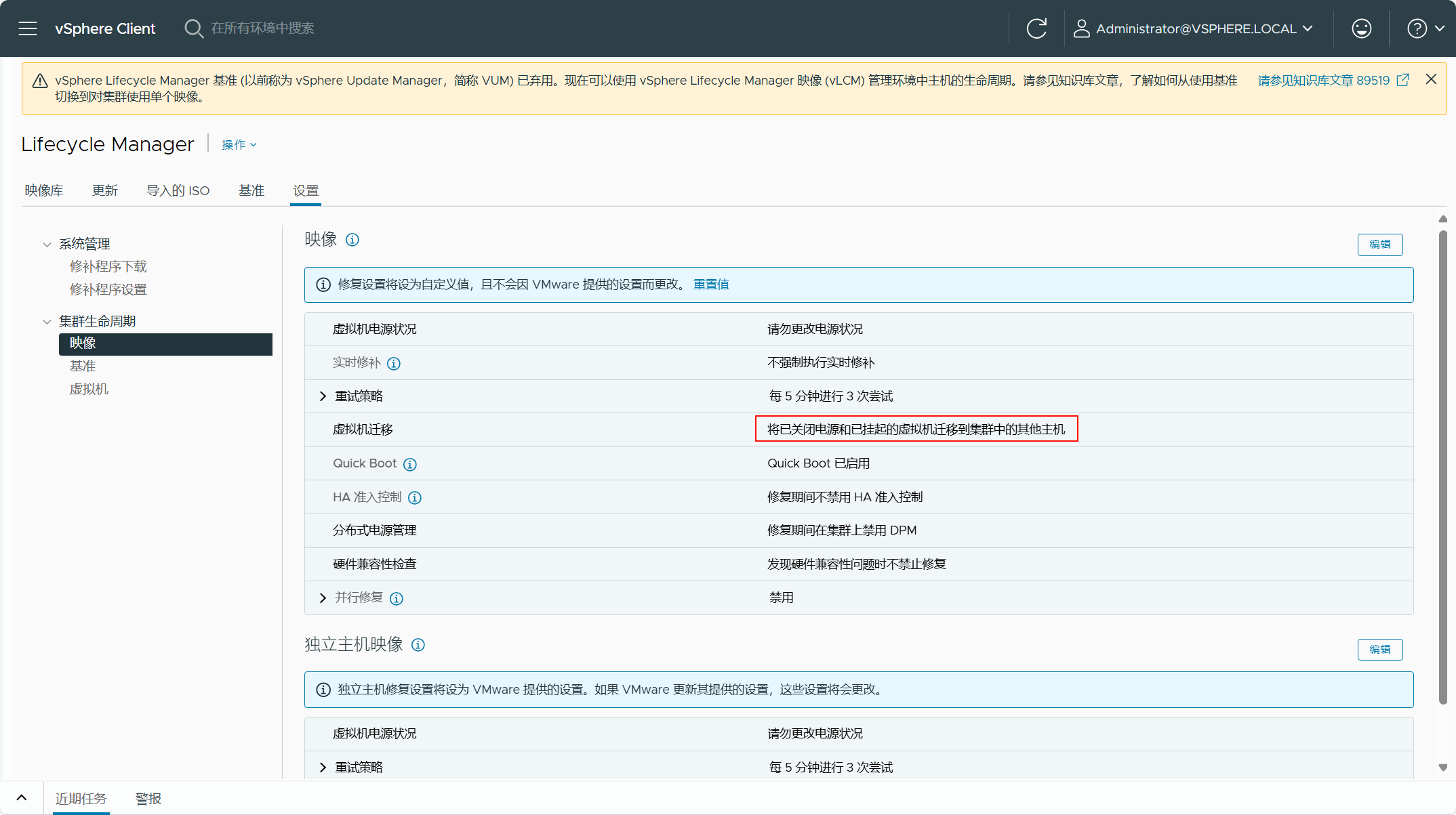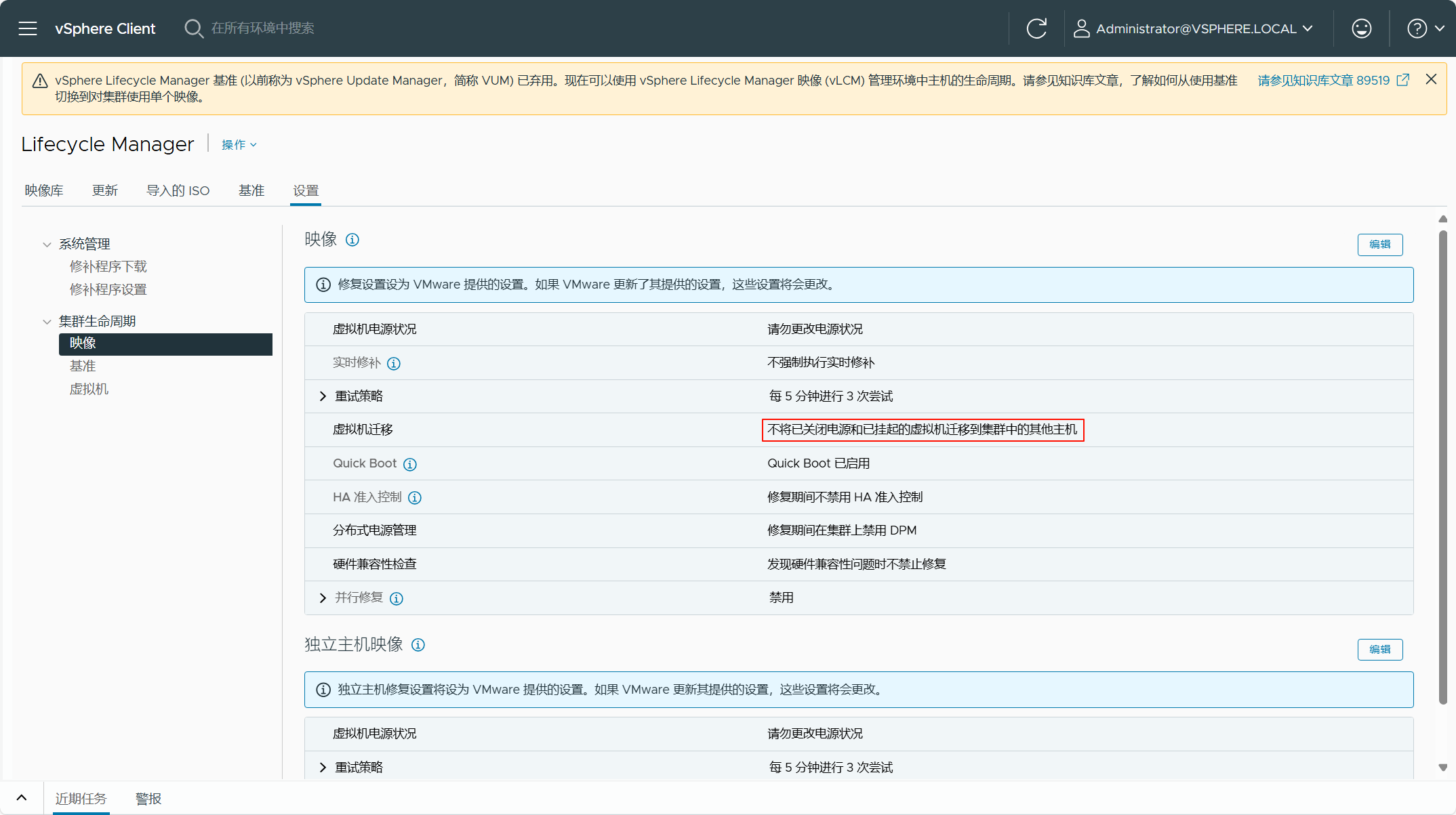 根据上面所查看的 JSON 文件,有一个检查失败的原因是由于当前 vSphere 环境的 vLCM 配置有一项与 SDDC Manager 中的默认 vLCM 配置不一致导致的。其实,我们可以通过 ESX Upgrade Policy Guardrail Failure 查看 SDDC Manager 中 vLCM 的默认配置,检查当前 vSphere 环境的 vLCM 配置,然后将这些配置调整为 SDDC Manager 中 vLCM 的默认配置即可。当然,如果你不处理,这个失败的检查应该不会影响现有 vSphere 环境转换为管理域。根据错误的信息,将当前 vSphere 环境的 vLCM 配置修改为 SDDC Manager 中 vLCM 的默认配置,如下图所示。