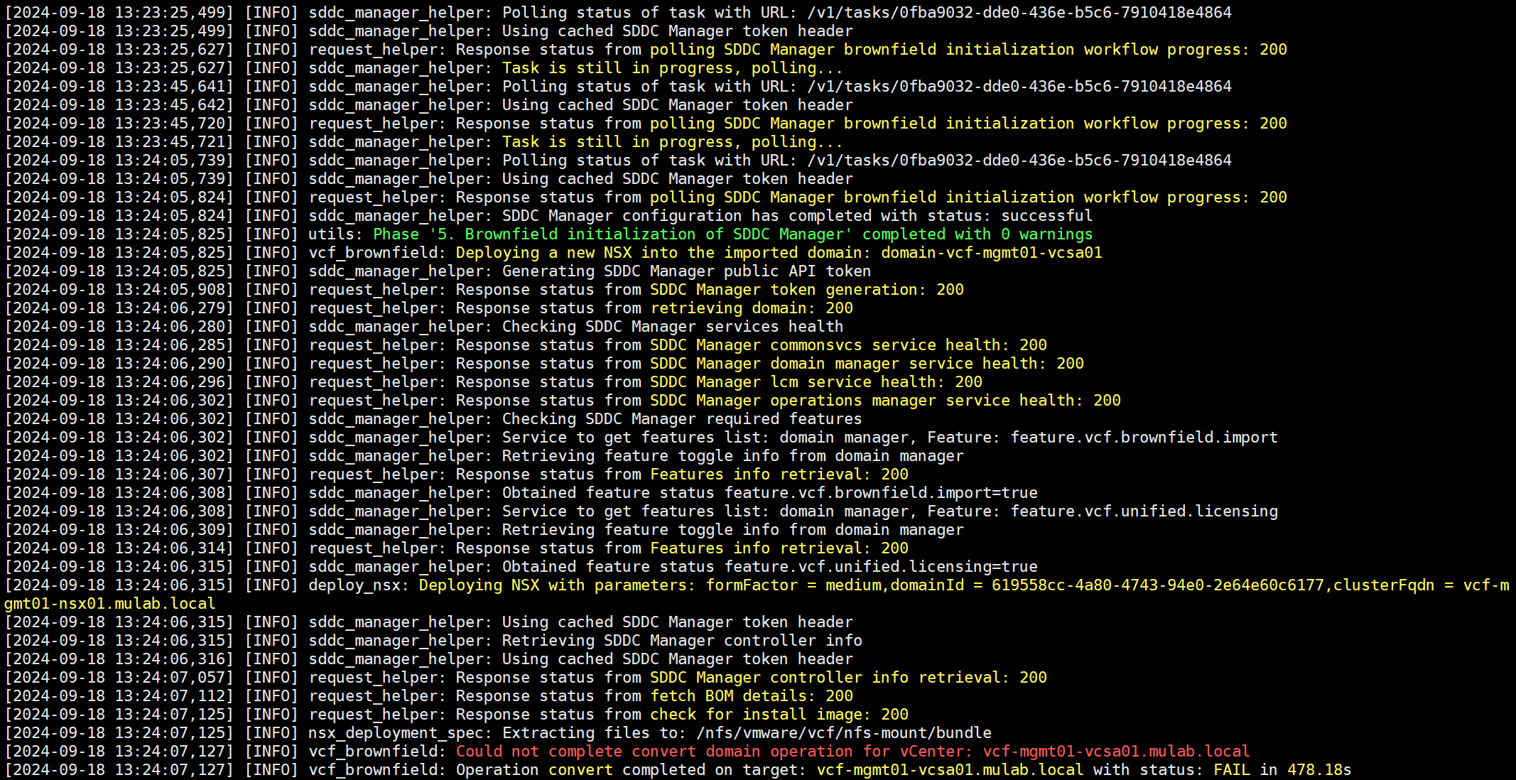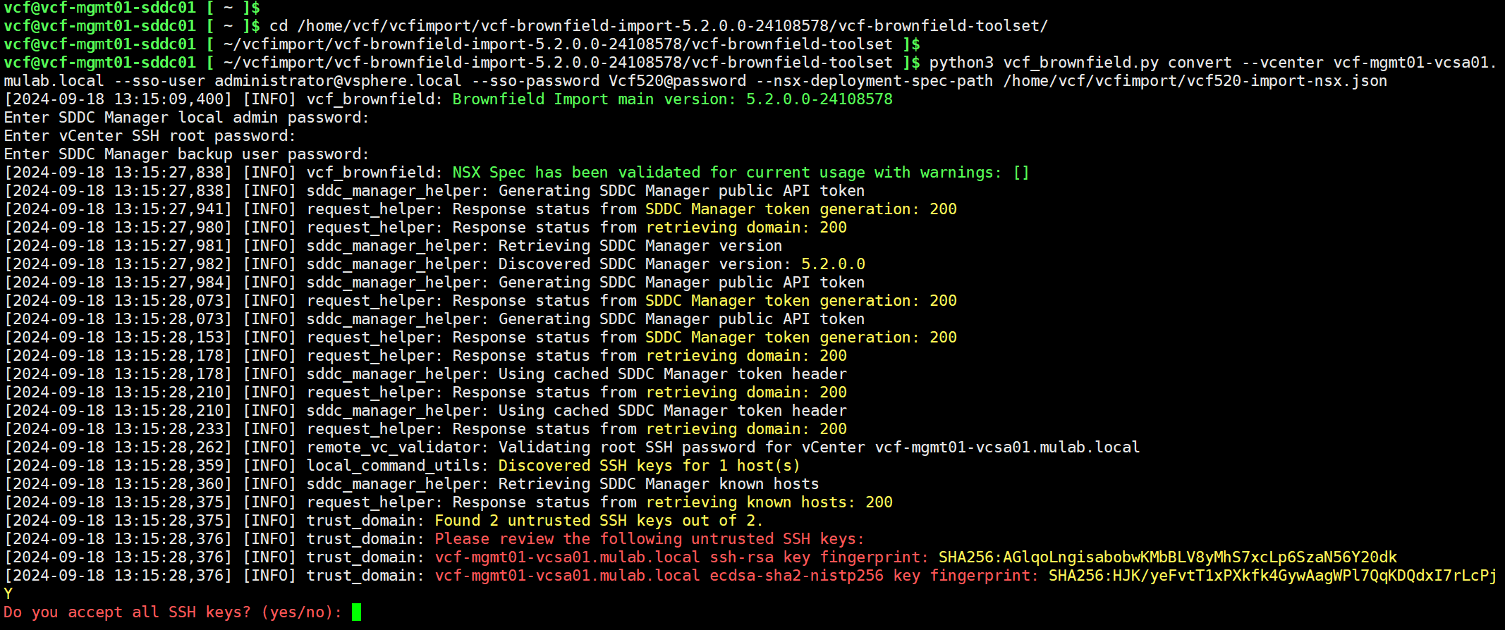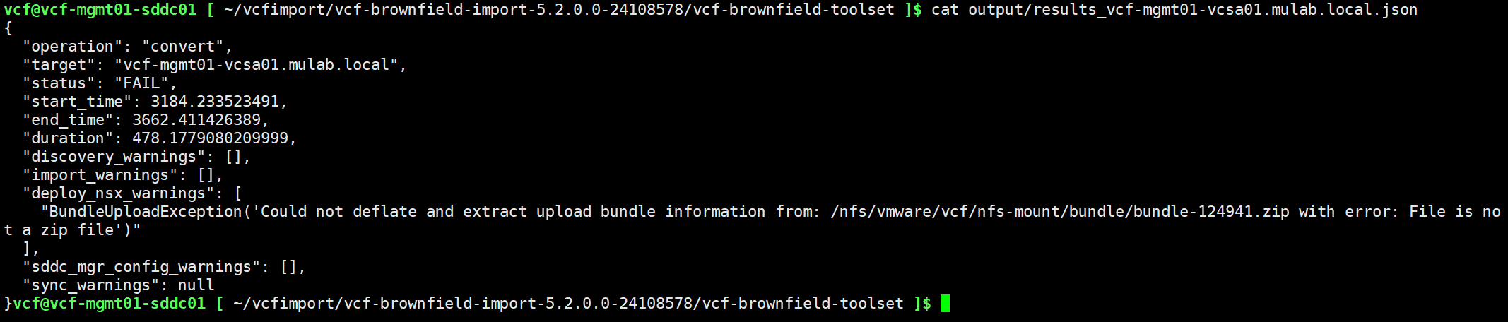 python3 vcf_brownfield.py convert --vcenter vcf-mgmt01-vcsa01.mulab.local --sso-user administrator@vsphere.local --sso-password Vcf520@password --nsx-deployment-spec-path /home/vcf/vcfimport/vcf520-import-nsx.json