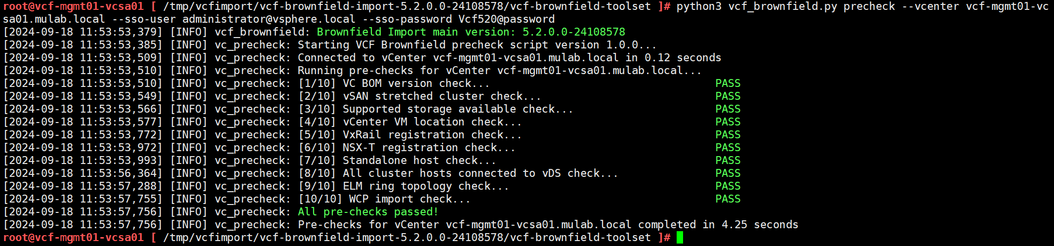 python3 vcf_brownfield.py precheck --vcenter vcf-mgmt01-vcsa01.mulab.local --sso-user administrator@vsphere.local --sso-password Vcf520@password