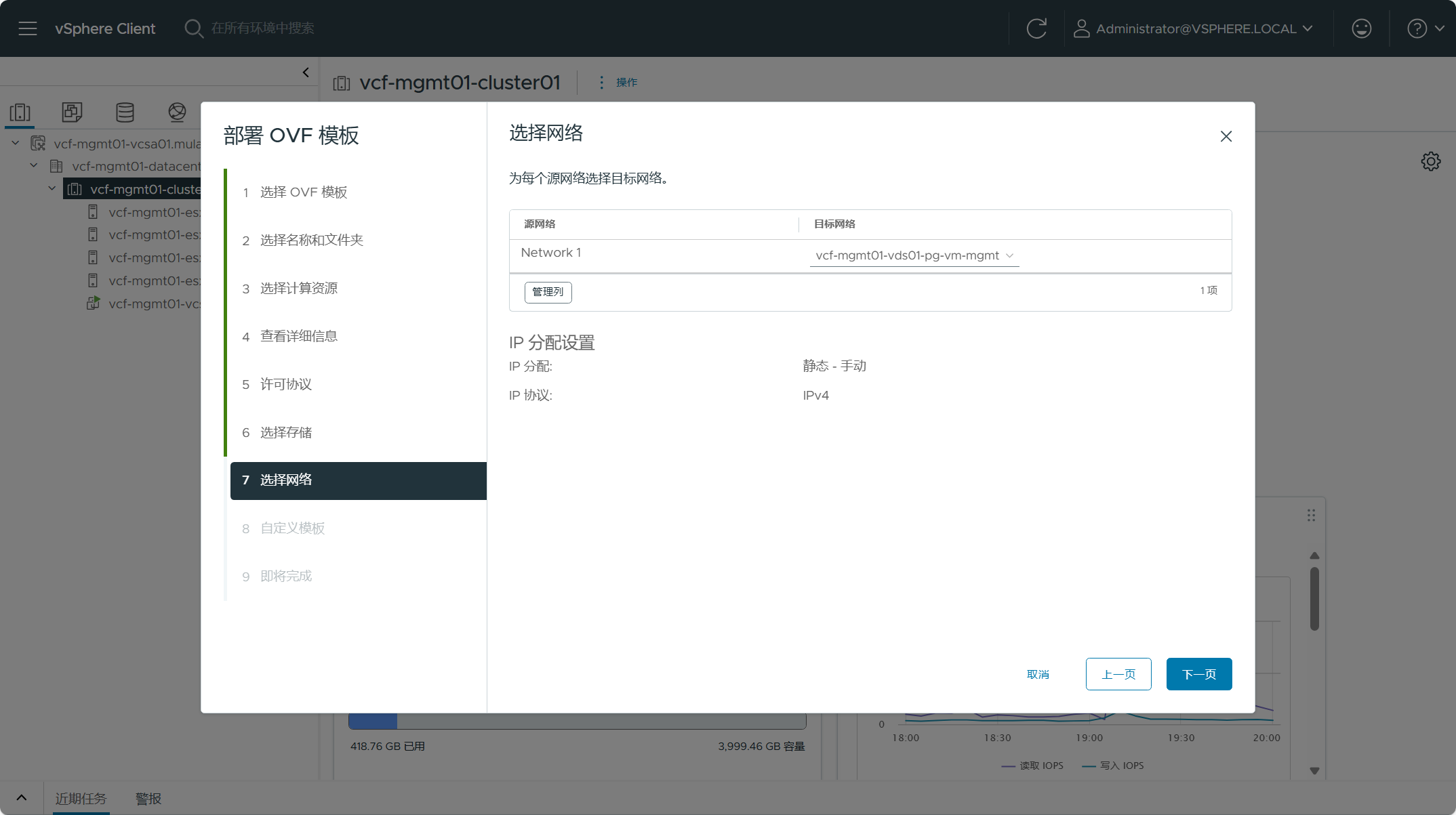 选择 SDDC Manager 虚拟机所使用的网络端口组,点击下一页。
