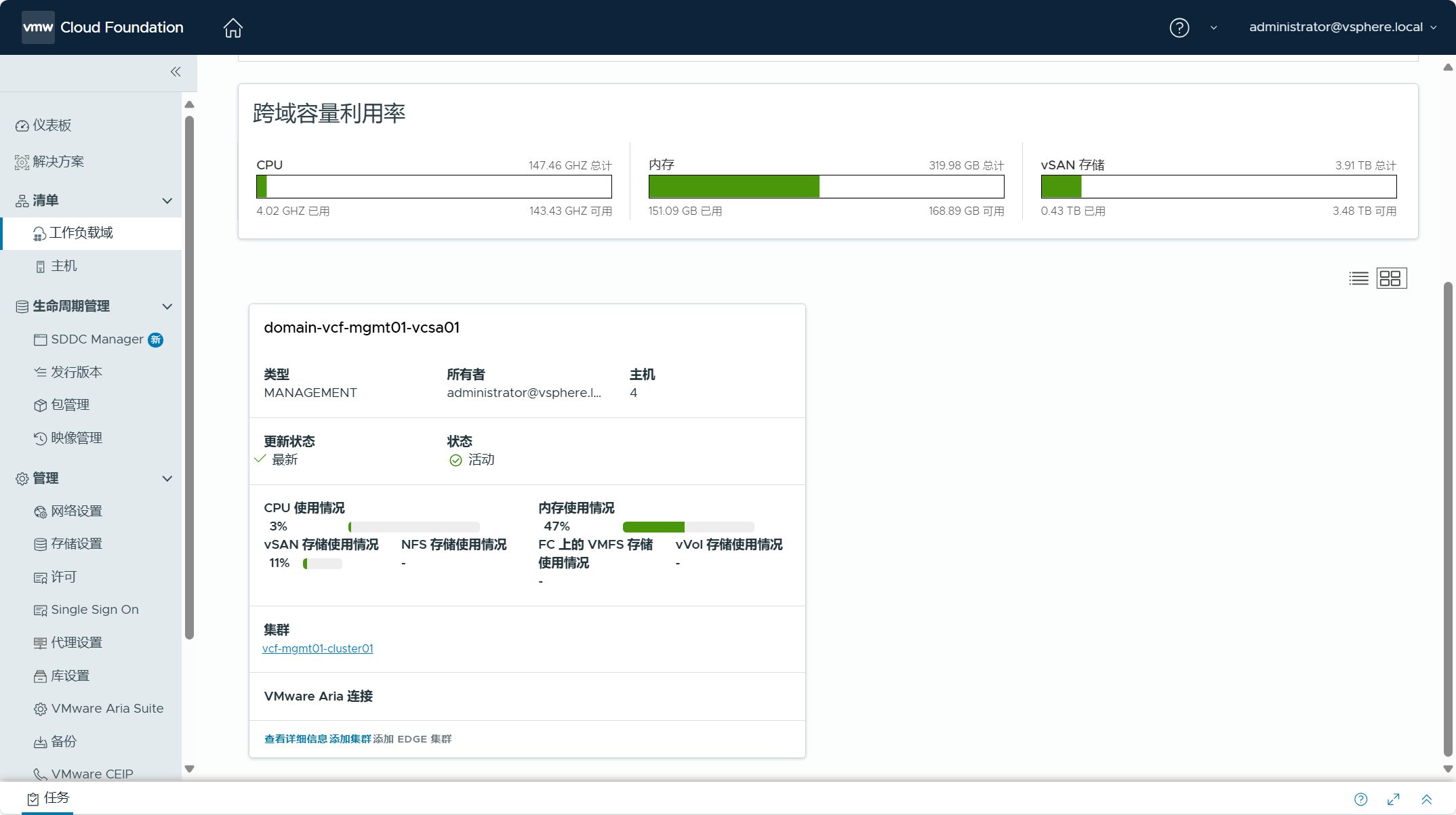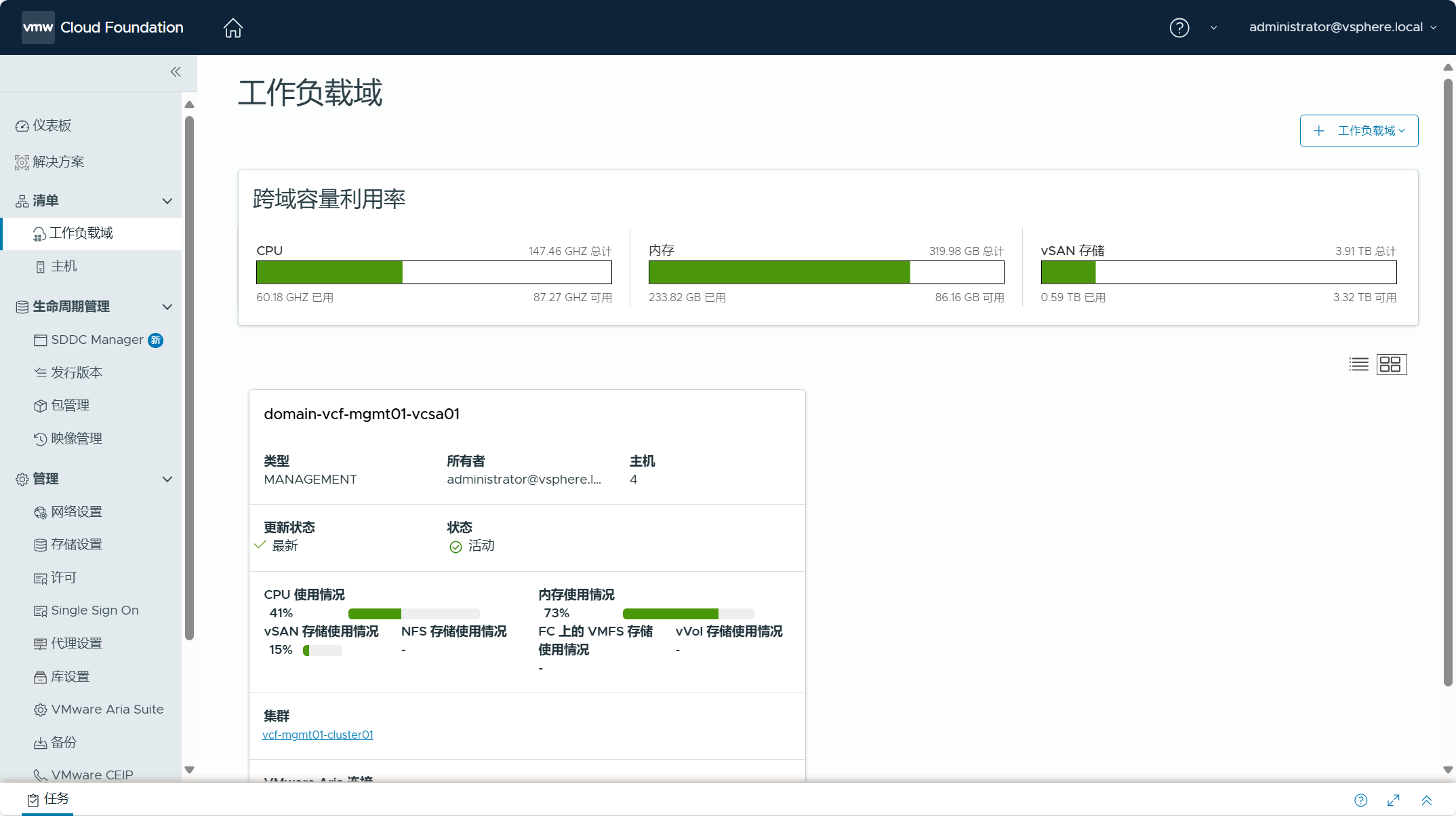 导航到 SDDC Manager UI->清单->工作负载域,可以看到现有 vSphere 环境已经被转换成管理域,管理域的名称为 domain-vcf-mgmt01-vcsa01。