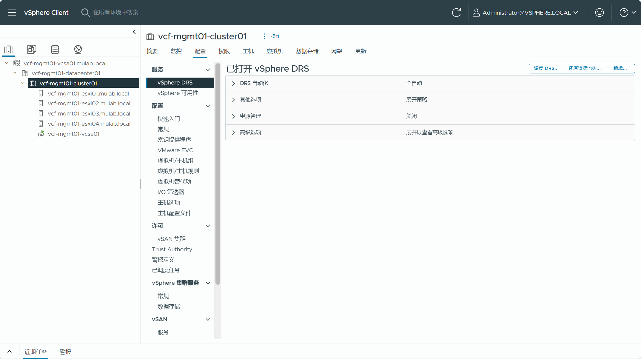现有 vSphere 环境中的集群 DRS 配置必须是全自动的。