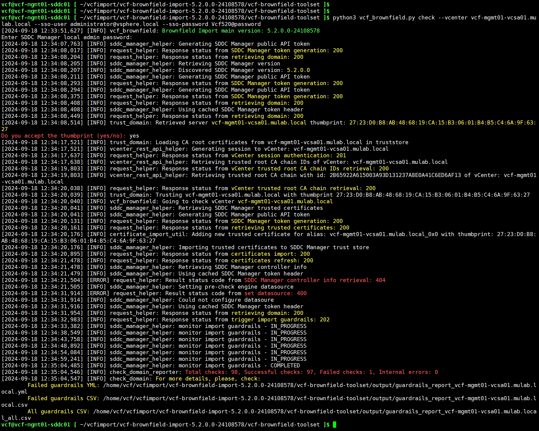 进入 VCF Import Tool 目录后,使用以下命令在 SDDC Manager 上执行环境检查。总共有 98 个内容,成功检查 97 个,失败 1 个。