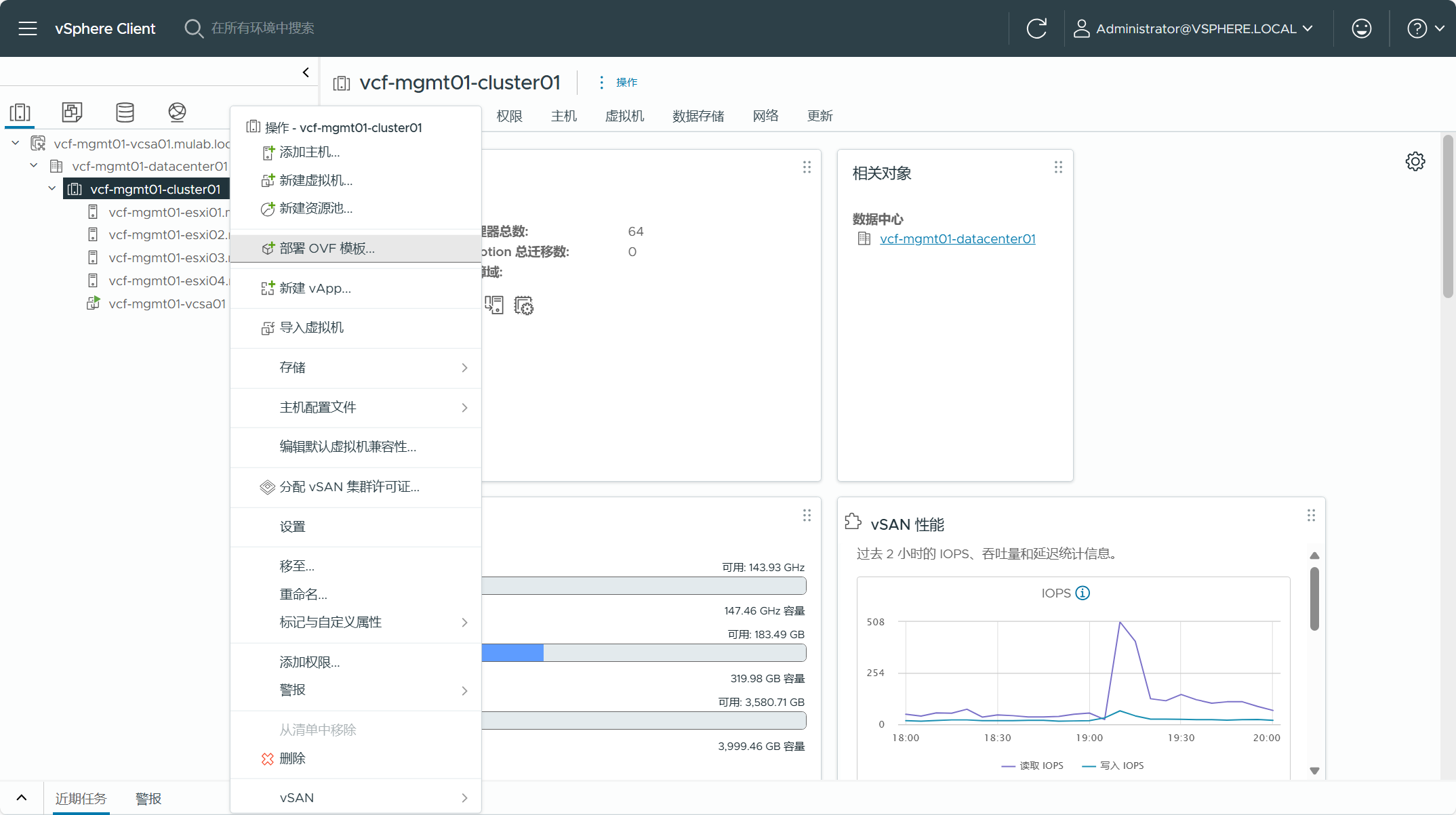 导航到 vCenter Server(vSphere Client)->数据中心->集群,右击选择“部署 OVF 模板”。