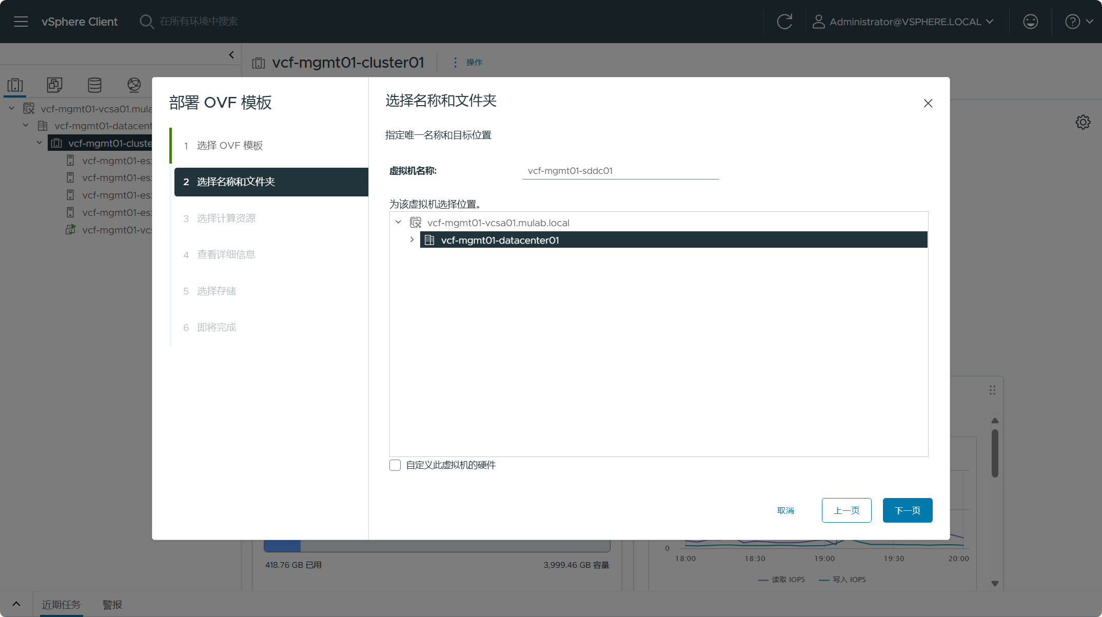 配置 SDDC Manager 虚拟机的名称并选择存放的位置,点击下一页。