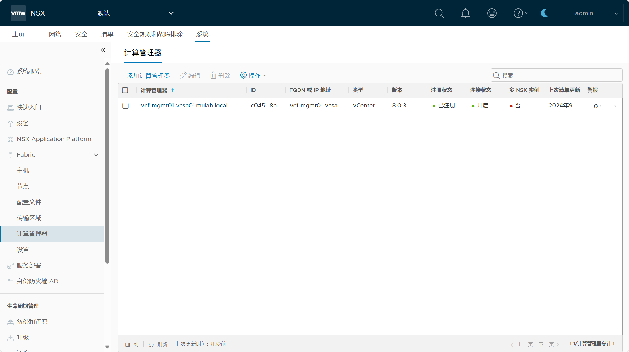 管理域 vCenter Server 已作为计算管理器被添加到 NSX 当中。