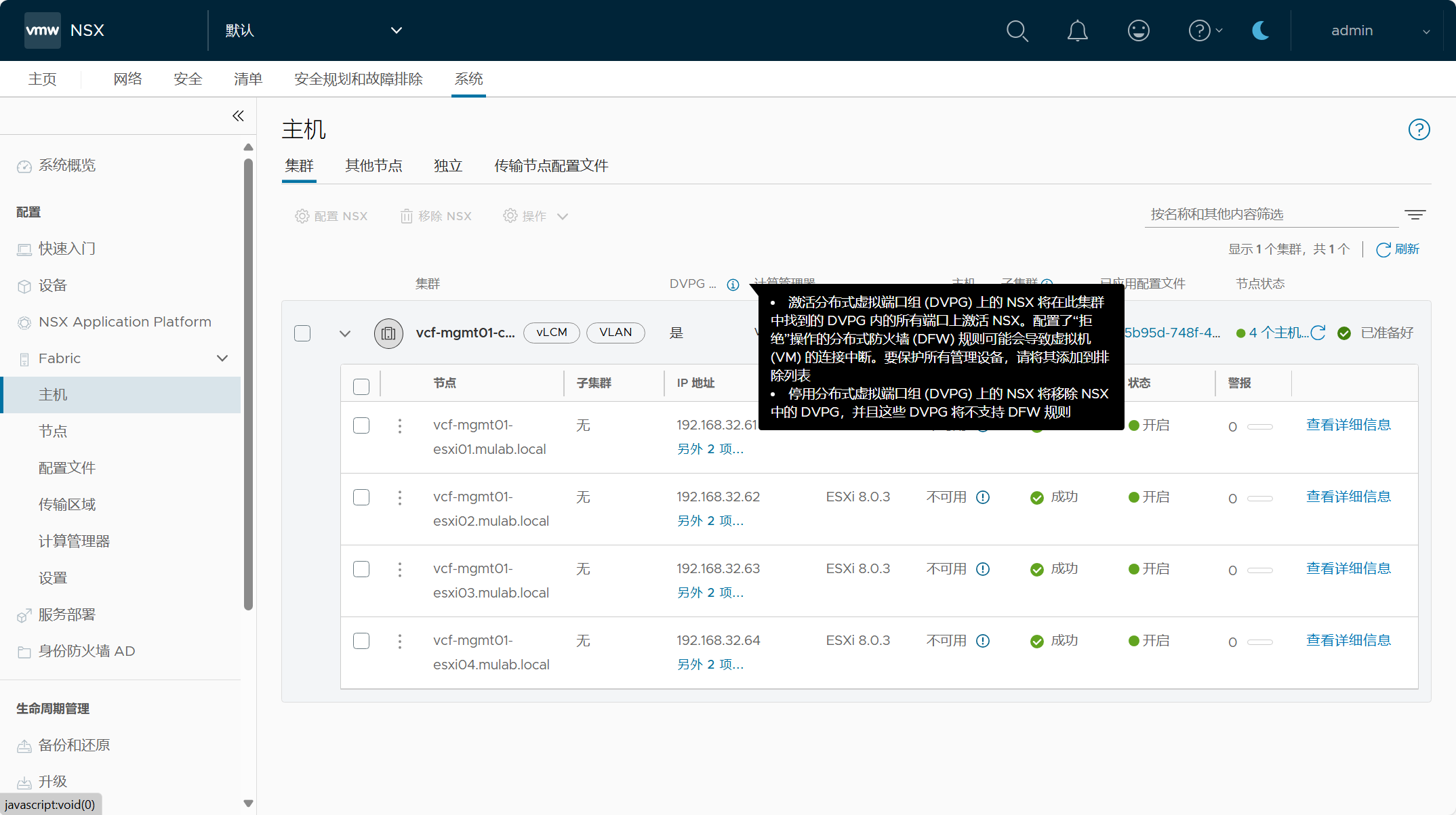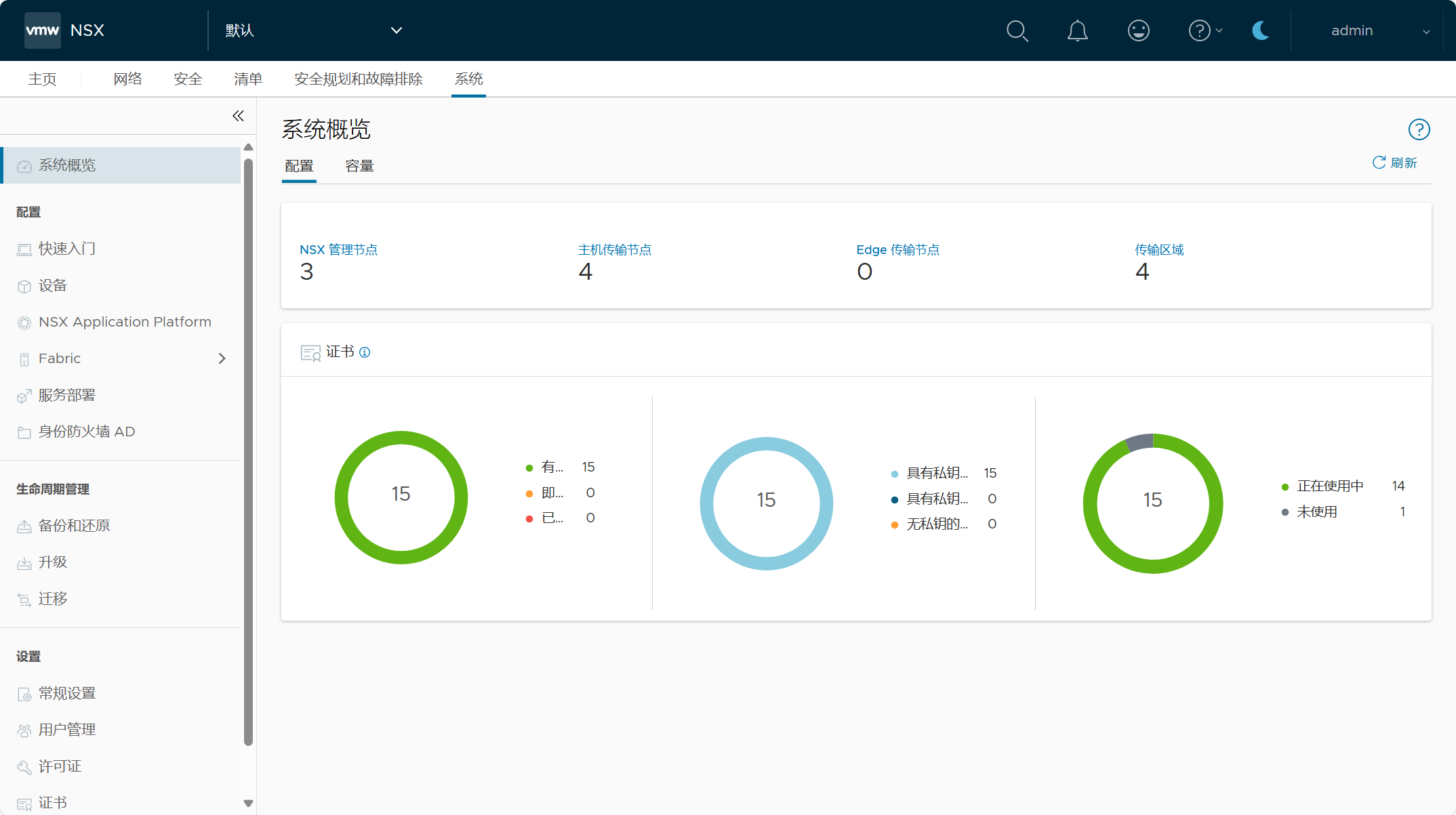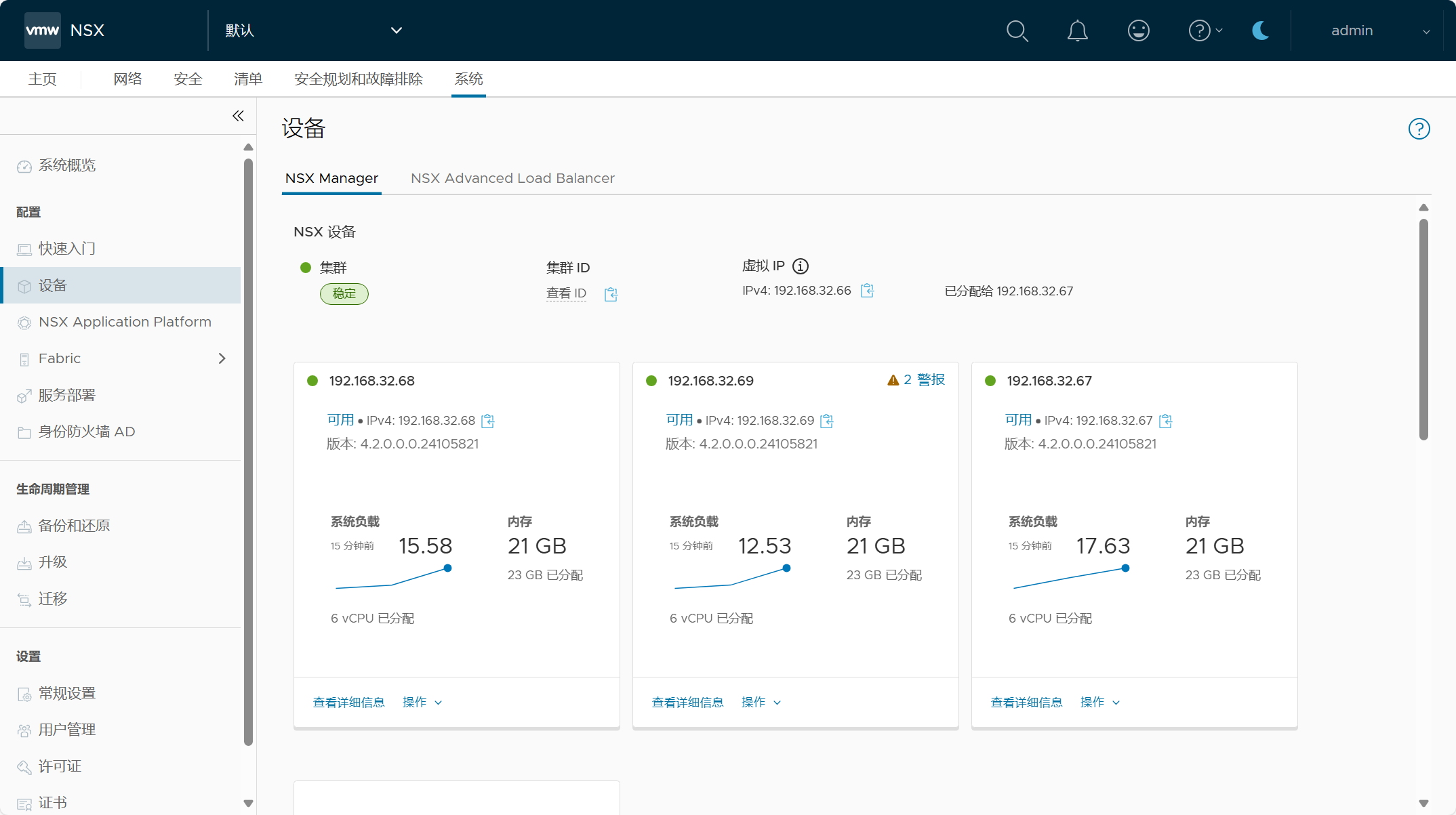 登录 NSX Manager UI(VIP),查看 NSX 系统配置概览。