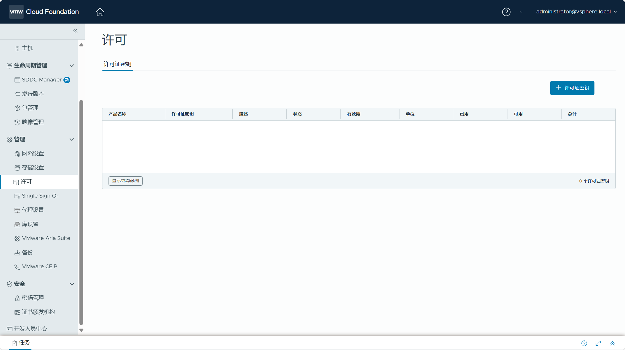 导航到 SDDC Manager UI->管理->许可,由于当前管理域中产品缺少许可证,可以点击“许可证密钥”为该域中的产品分配许可证密钥。