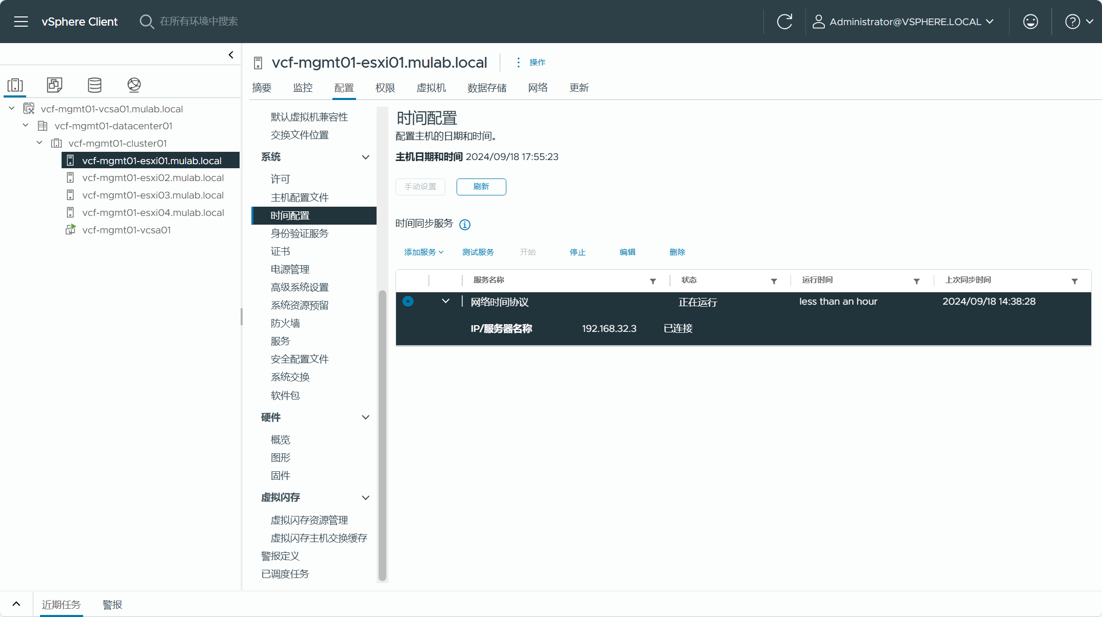 集群内每个 ESXi 主机都应该配置了 NTP 时钟同步。同样,vCenter Server 也应该配置。
