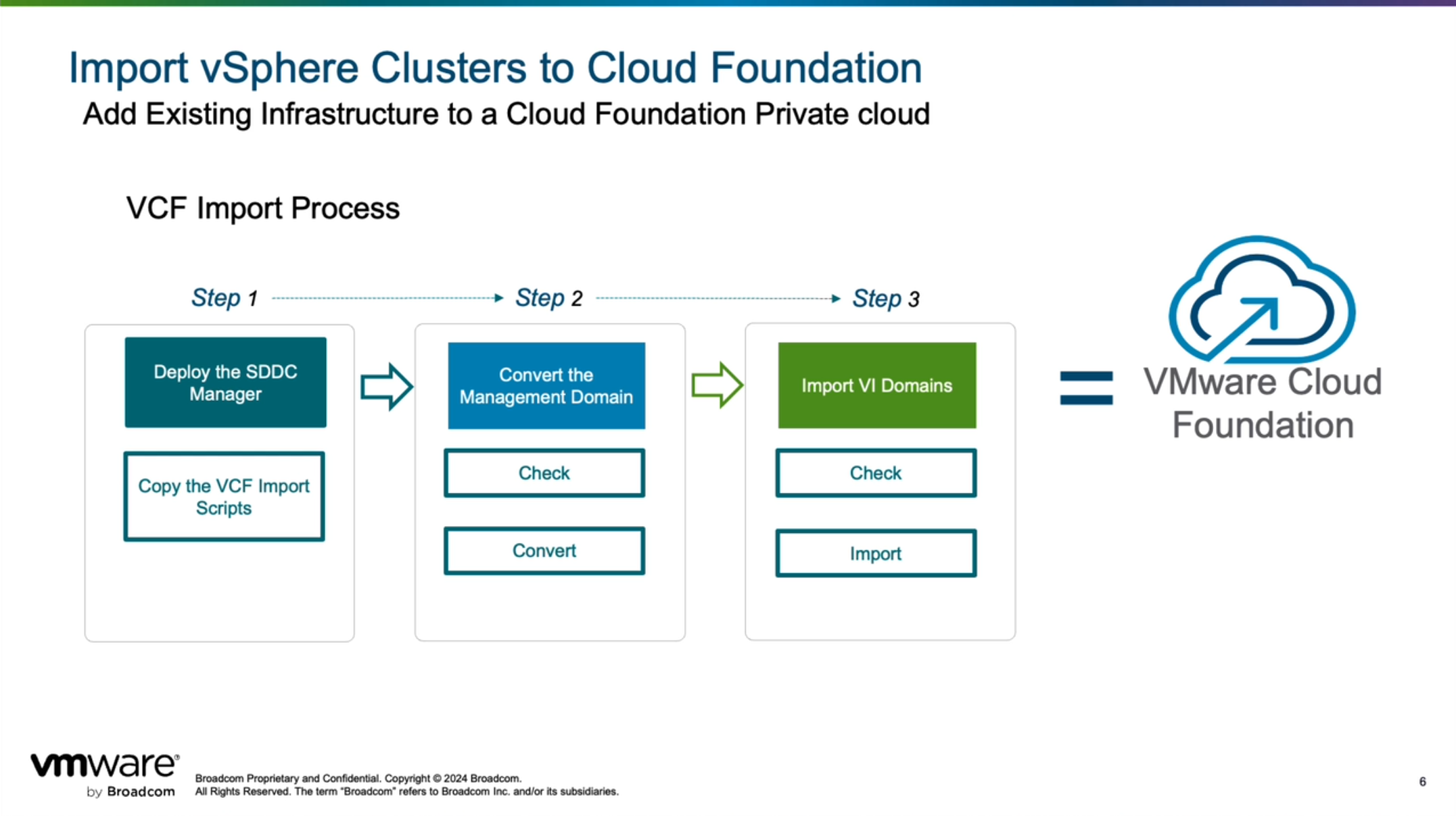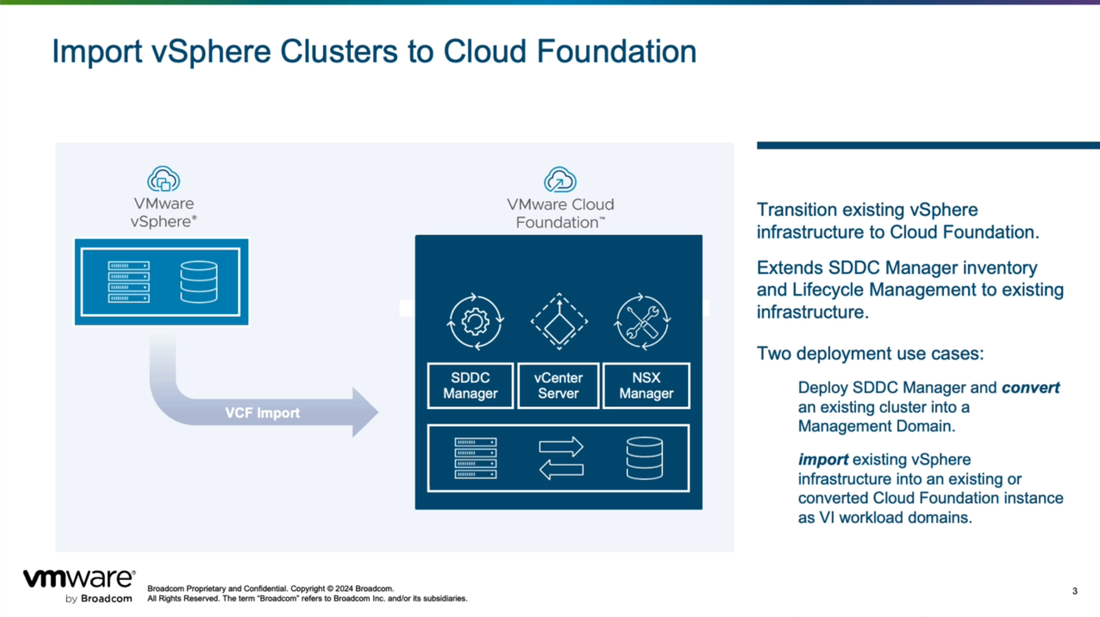 VMware Cloud Foundation 5.2 发布并引入了一个新的功能,借助 VCF Import Tool 工具可以将现有 vSphere 环境直接转换(Convert)为管理工作负载域或者导入(Import)为 VI 工作负载域。通过这种能力,客户无需购买新硬件和进行复杂的部署和迁移工作,即可将已有的环境快速转变为由 VMware Cloud Foundation 解决方案驱动的 SDDC 软件定义数据中心。使用这种方式,不会对现有的业务产生任何影响,即能够在不中断工作负载的情况下完成所有转换过程。