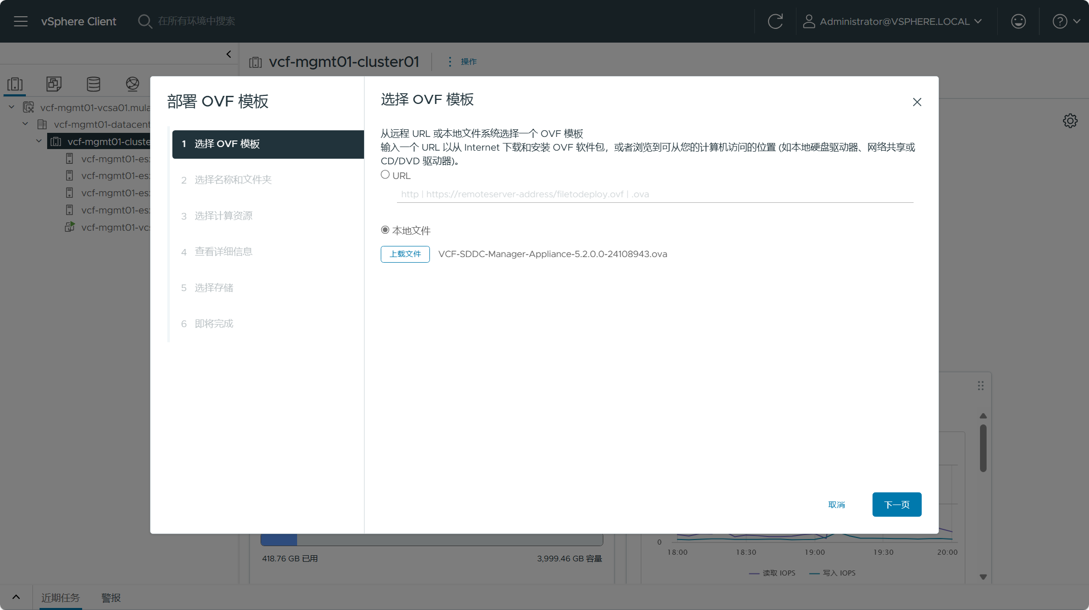 选择从本地文件上载 SDDC Manager OVA 设备,点击下一页。
