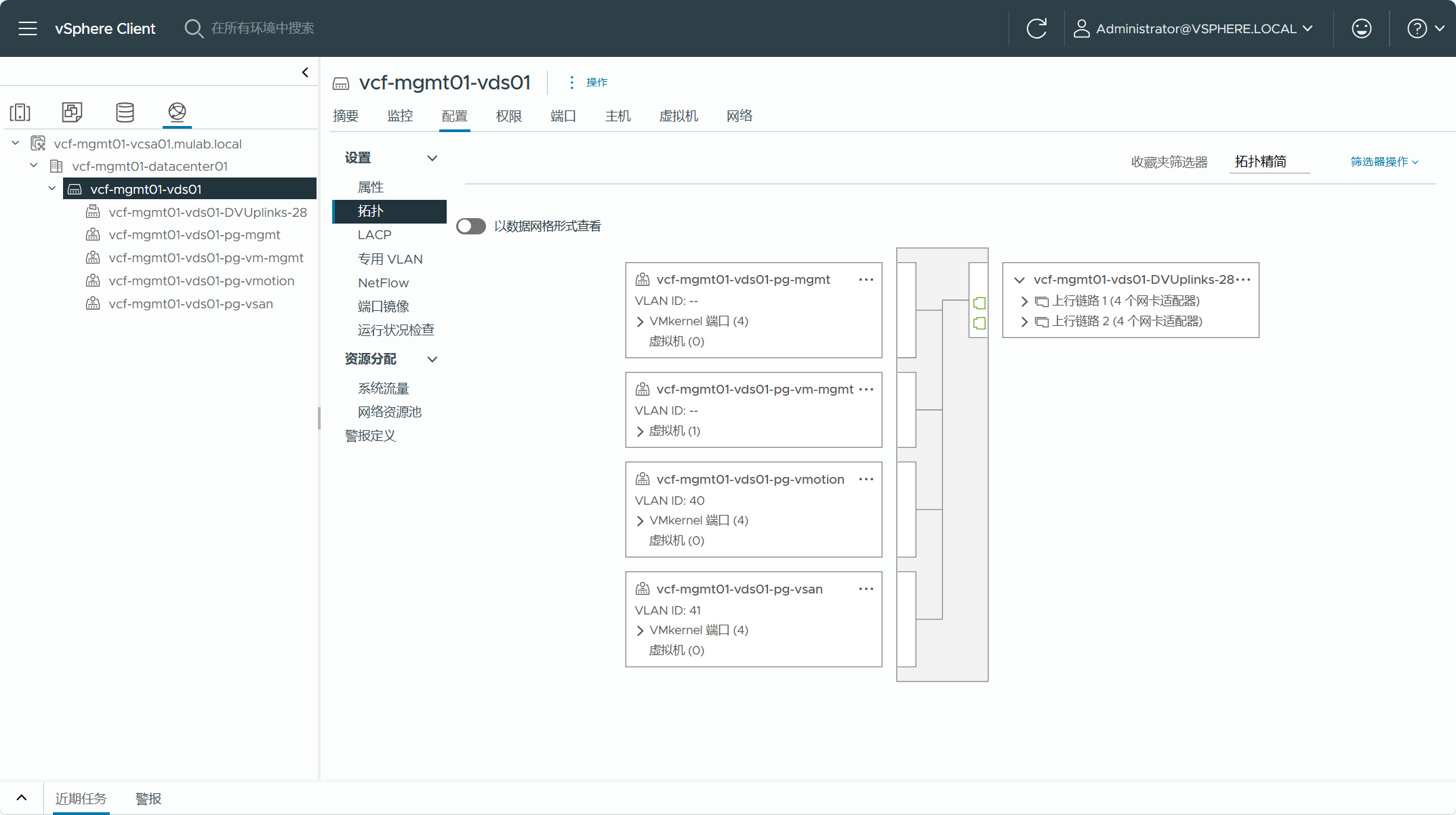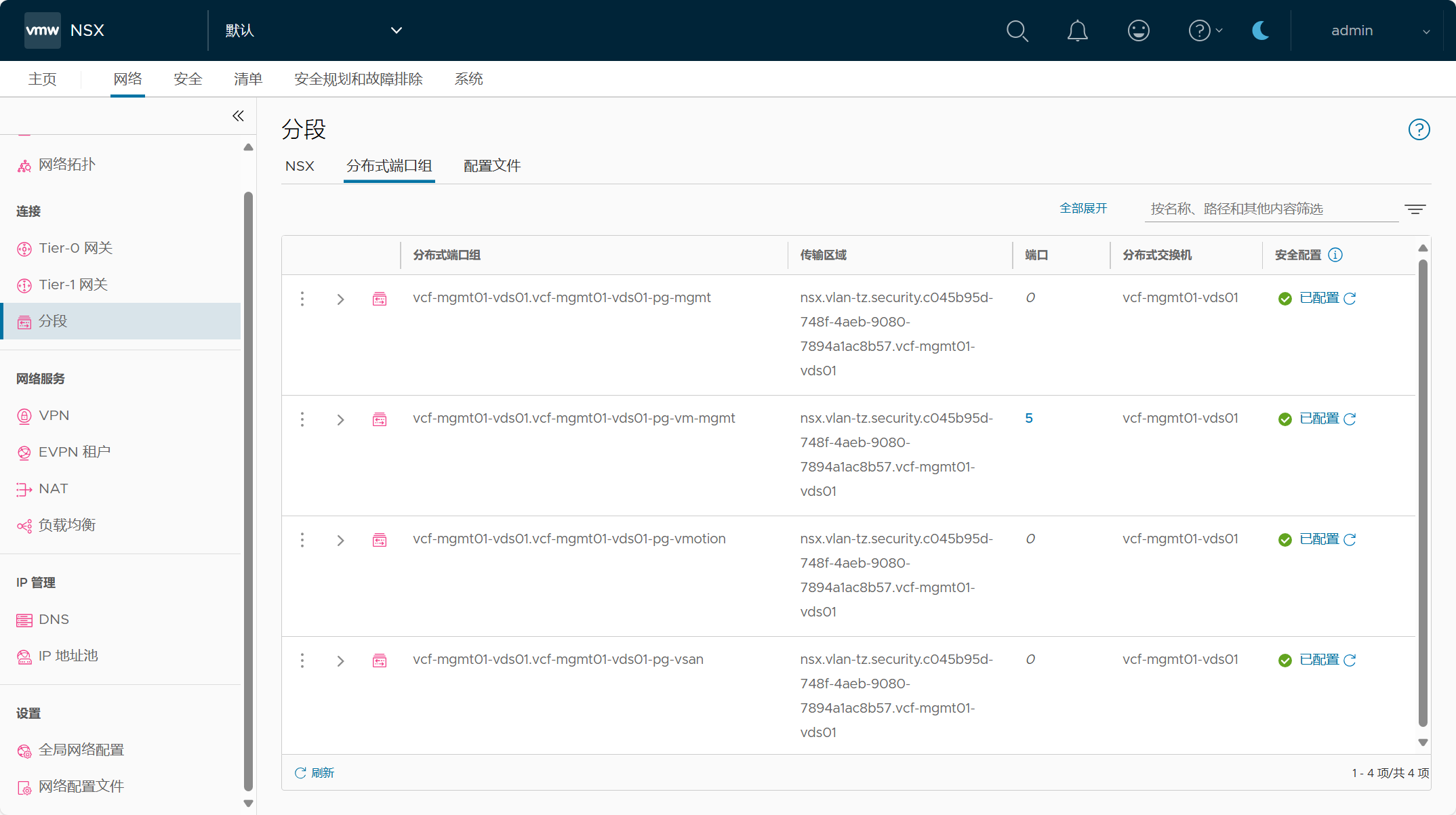 管理域集群中的主机已配置了分布式虚拟端口组(DVPG)的NSX,也就是 NSX-Security only 仅安全功能,也就是说可以将 NSX 的安全功能应用于管理域 vCenter Server 上连接至虚拟端口组的管理组件虚拟机。