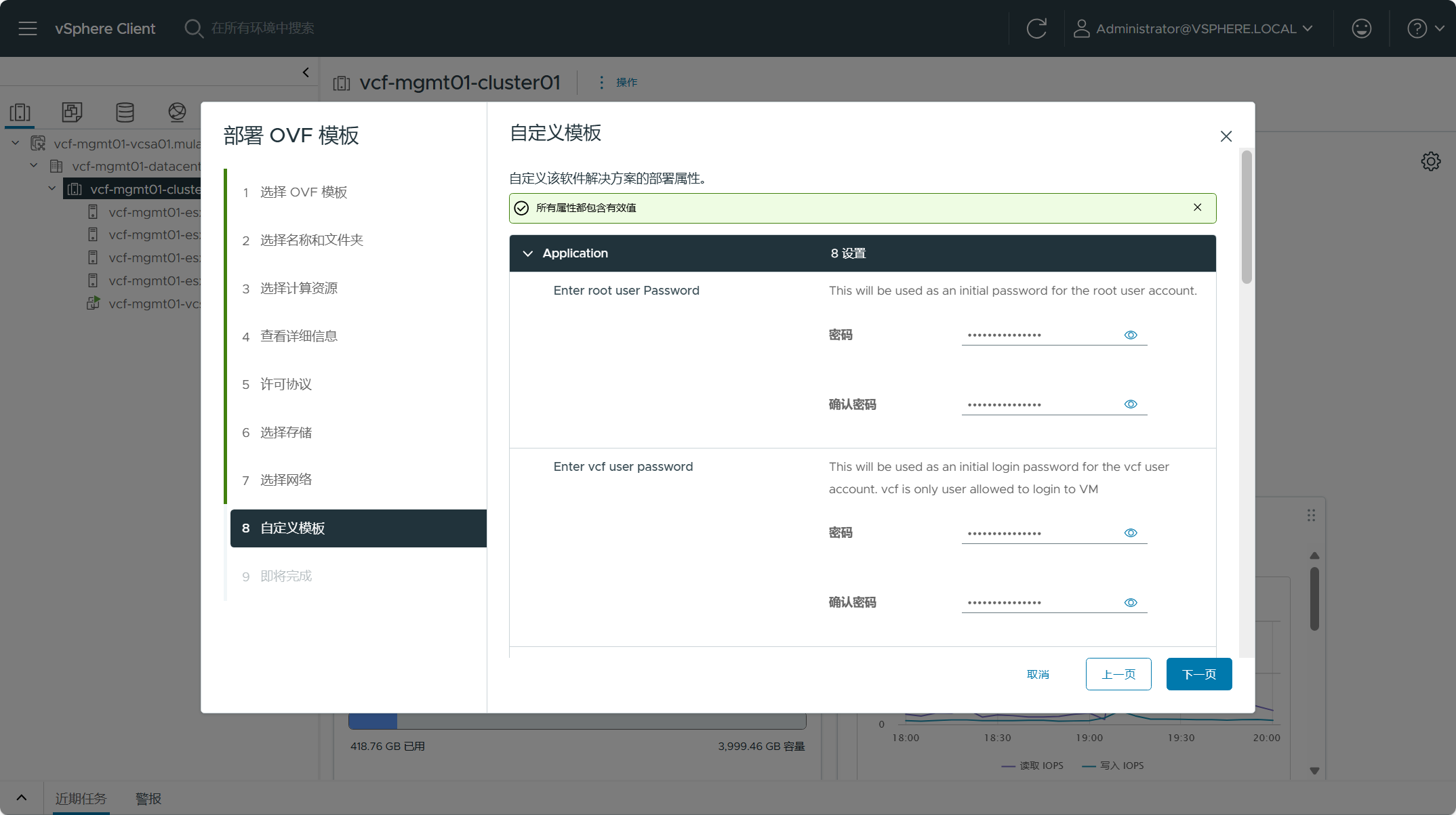 配置 SDDC Manager 虚拟机各类用户的密码以及地址等信息,点击下一页。