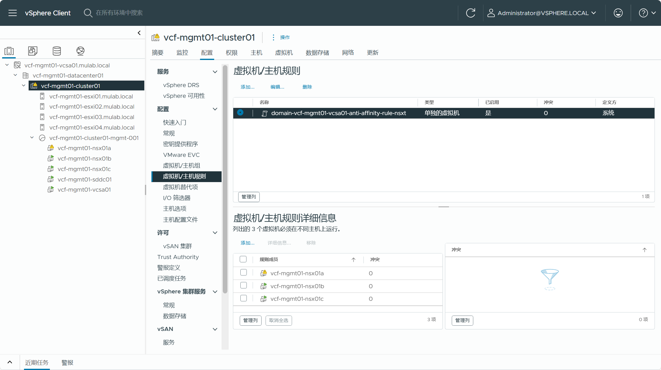 登录 vCenter Server(vSphere Client),可以看到三个 NSX Manager 设备已被部署到管理域集群当中,并且创建了虚拟机/主机关联性规则,三个虚拟机必须在不同的主机上运行,这就是为什么如果使用转换(Convert)将现有 vSphere 环境转换为管理域,如果没有使用 vSAN 解决方案,使用了 NFS 或者 FC SAN,如果要部署 NSX 的话就需要三台主机,如果不部署 NSX 的话可以只需要两台主机。