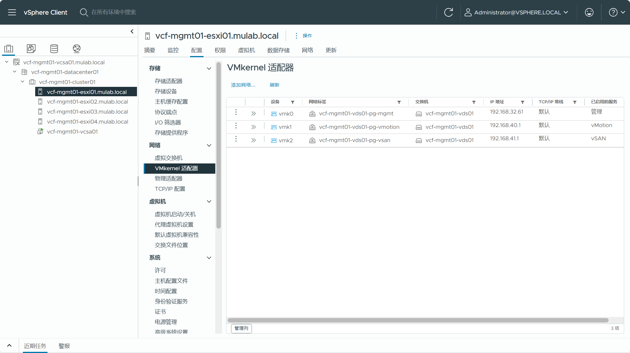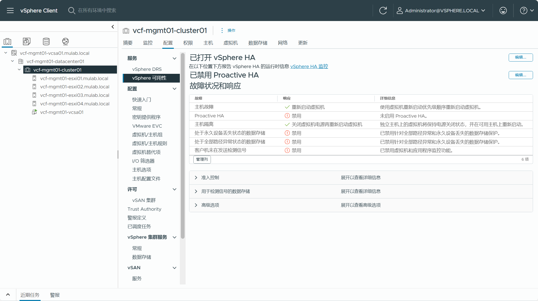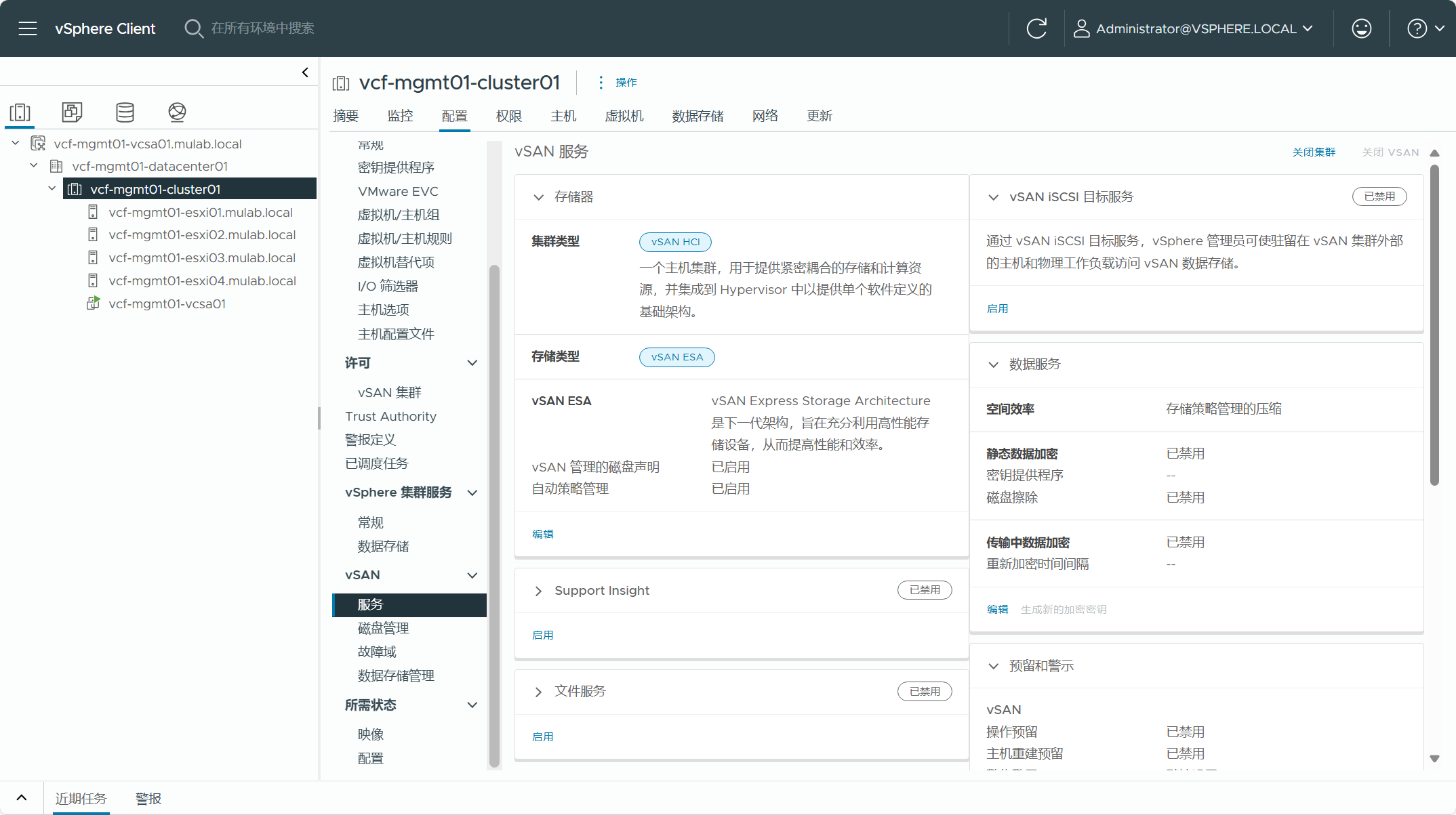 使用 VCF Import Tool 工具有各种限制和注意事项,针对这些情况,下面让我们确认一下现有 vSphere 环境中的信息,以确保能满足转换要求。由于我这边是通过嵌套虚拟化搭建准备的环境,这跟实际环境肯定会有所区别,如果你也想搭建这样的测试环境,可以参考这篇(一次性说清楚 vCenter Server 的 CLI 部署方式。)文章中的方法,部署单节点 vSAN ESA 集群后再添加并配置其他 ESXi 主机。