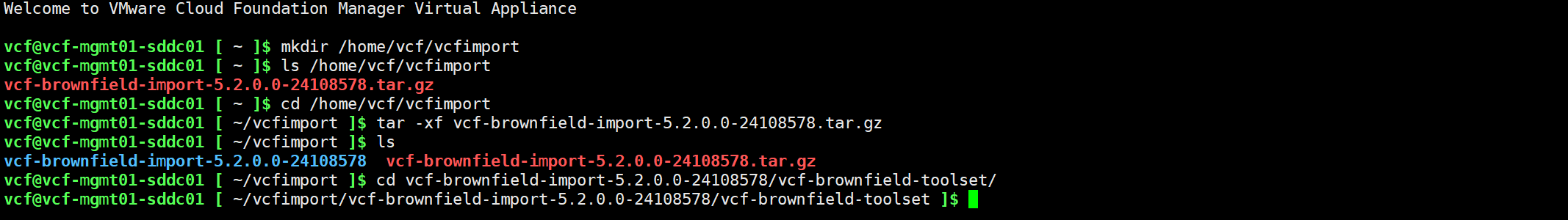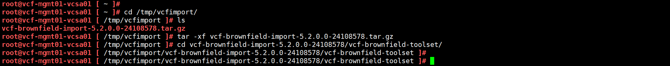 tar -xf /tmp/vcfimport/vcf-brownfield-import-5.2.0.0-24108578.tar.gz