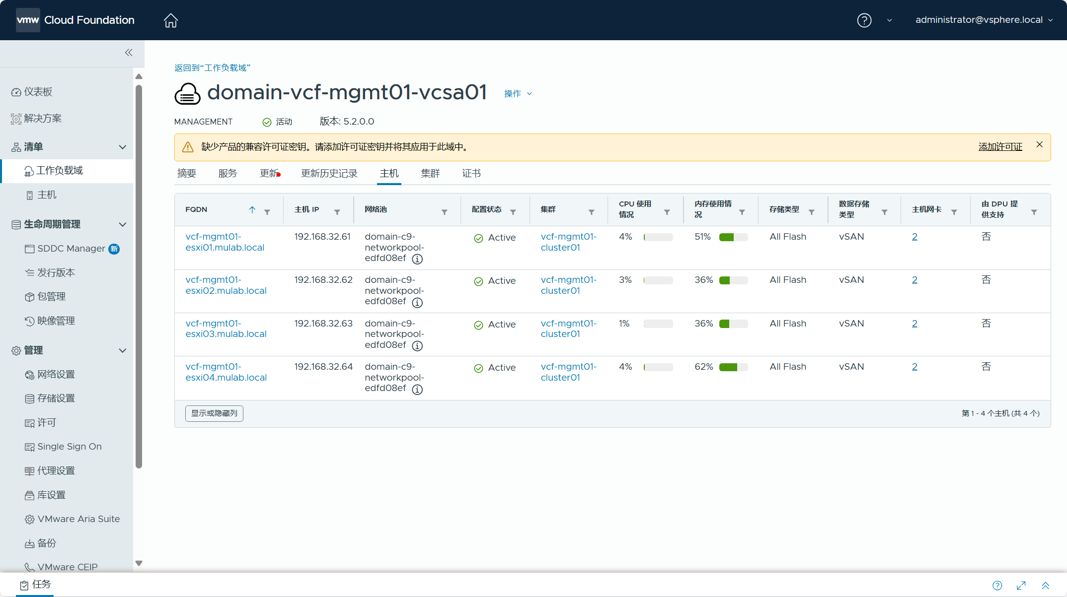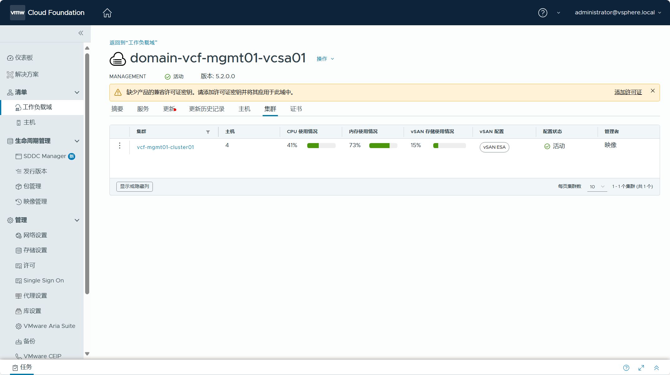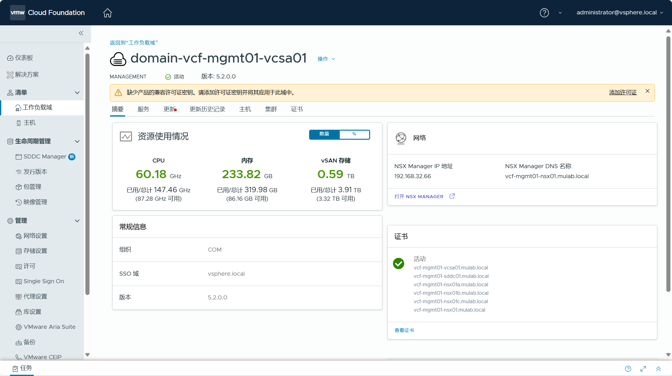 点击进入管理域,查看该工作负载域的摘要信息,提示当前管理域中的产品缺少许可证,需要点击“添加许可证”为该域中的产品分配许可证密钥。