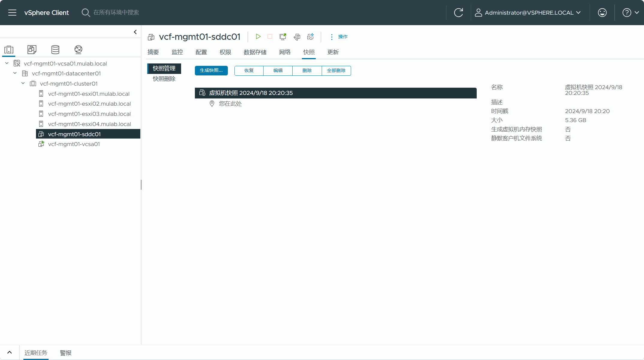 部署成功后,可以对 SDDC Manager 虚拟机创建一个快照。