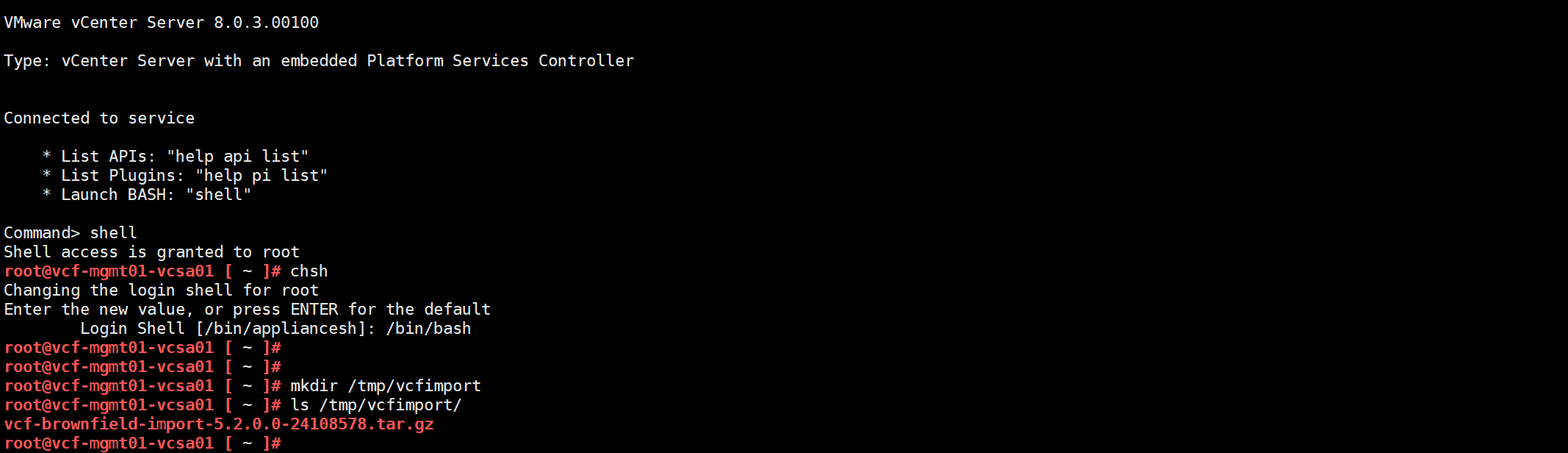 准备了相关软件和工具后,可以使用 VCF Import Tool 工具先对当前的 vSphere 环境进行验证一下,看看现有 vSphere 环境是否有那些地方不符合 VCF Import Tool 转换(Convert)或导入(Import)的要求。通过 SSH 以 root 用户连接到 vCenter Server 并进入 Shell 命令行,运行 chsh 命令将 vCenter Server 的默认终端命令行从 API 改成 Shell,然后创建一个临时目录(vcfimport),将 VCF Import Tool 工具上传到这个目录。