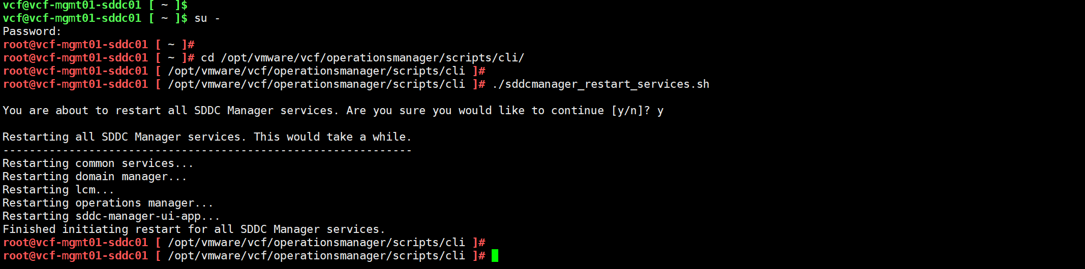 部署成功后,切换到 root 用户,重新启动 SDDC Manager 的所有服务,并等待 UI 重新初始化。