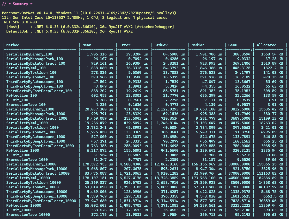 通过结果可以发现:[表达式树]和[Emit] > [AutoMapper]和[DeepCloner] > [MessagePack] > 其他