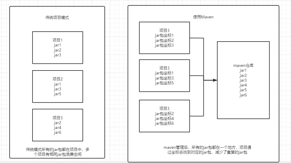 连带依赖jar包:jar包往往不是独立的,许多jar包需要依赖于其他jar包才能进行工作.每当我们去引入一个新的jar包,我们并不知道这个jar包是否依赖于其他的jar包.若使用maven,可以自动将当前jar包所依赖的其他jar包全部注入进来,无需人工参与,节约了大量的人力精力